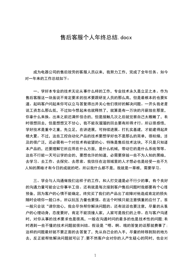 成为电器公司的售后效劳的客服人员以来,我努力工作,完成了全年任务。如今对一年来的工作总结如下: