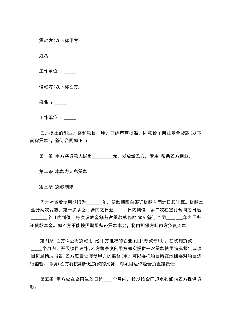 第一条甲方将贷款人民币_______元,发放给乙方,专用于帮助乙方创业。