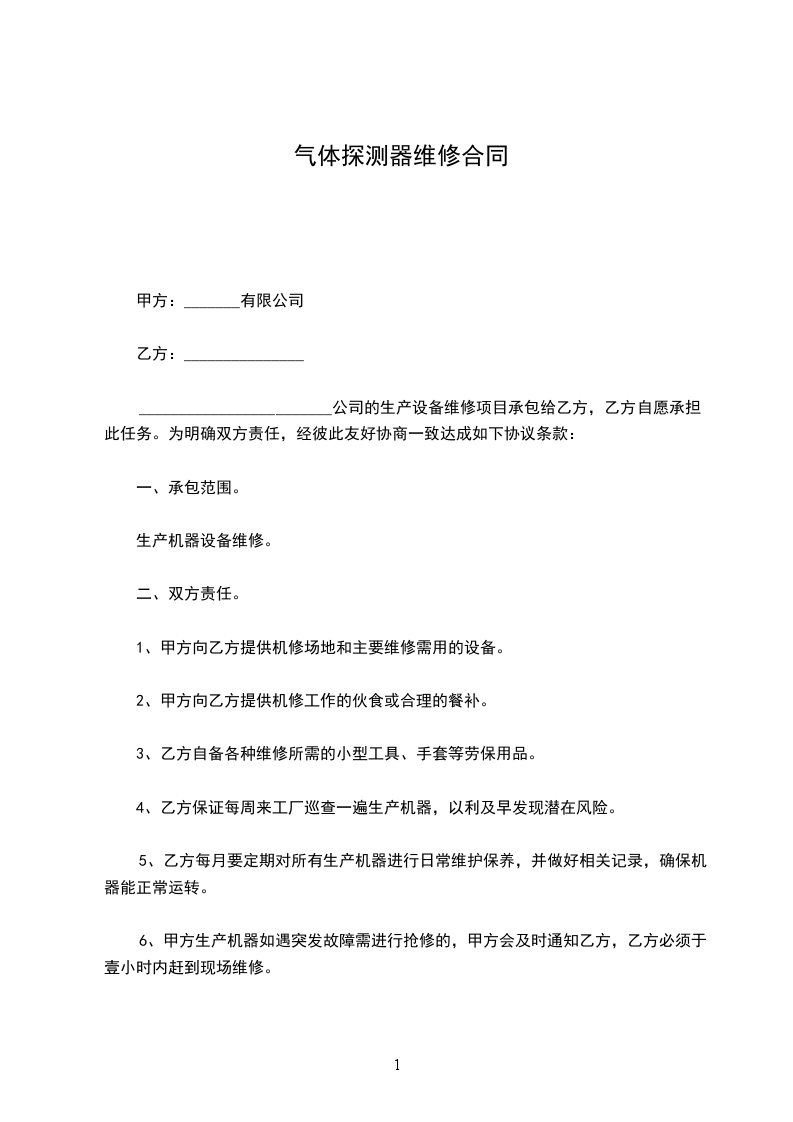 ________________________公司的生产设备维修项目承包给乙方,乙方自愿承担此任务。为明确双方责任,经彼此友好协商一致达成如下协议条款: