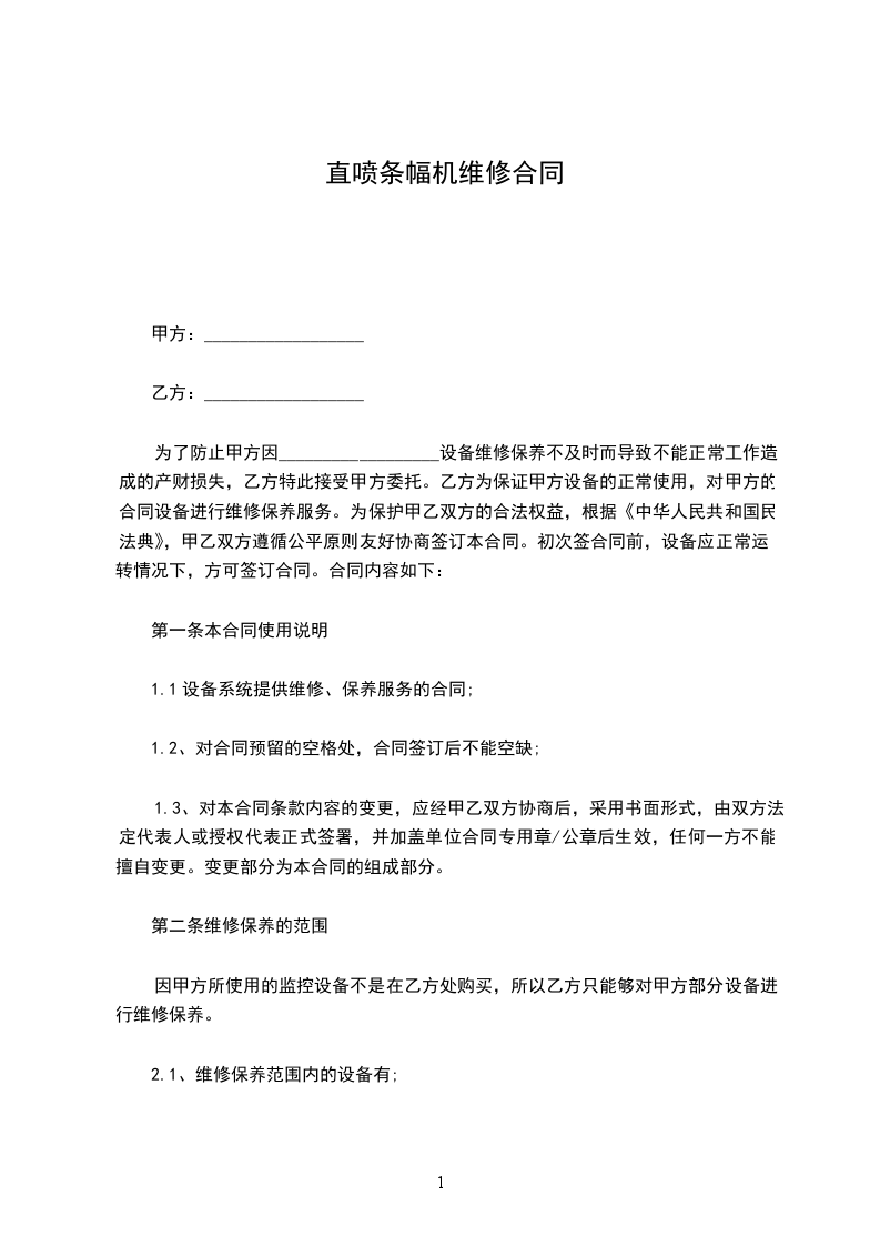 1、为了保障甲方______________设备的正常使用,合同期间内,乙方定期为甲方的_____________________设备进行维修保养,定期______________天保养一次。
