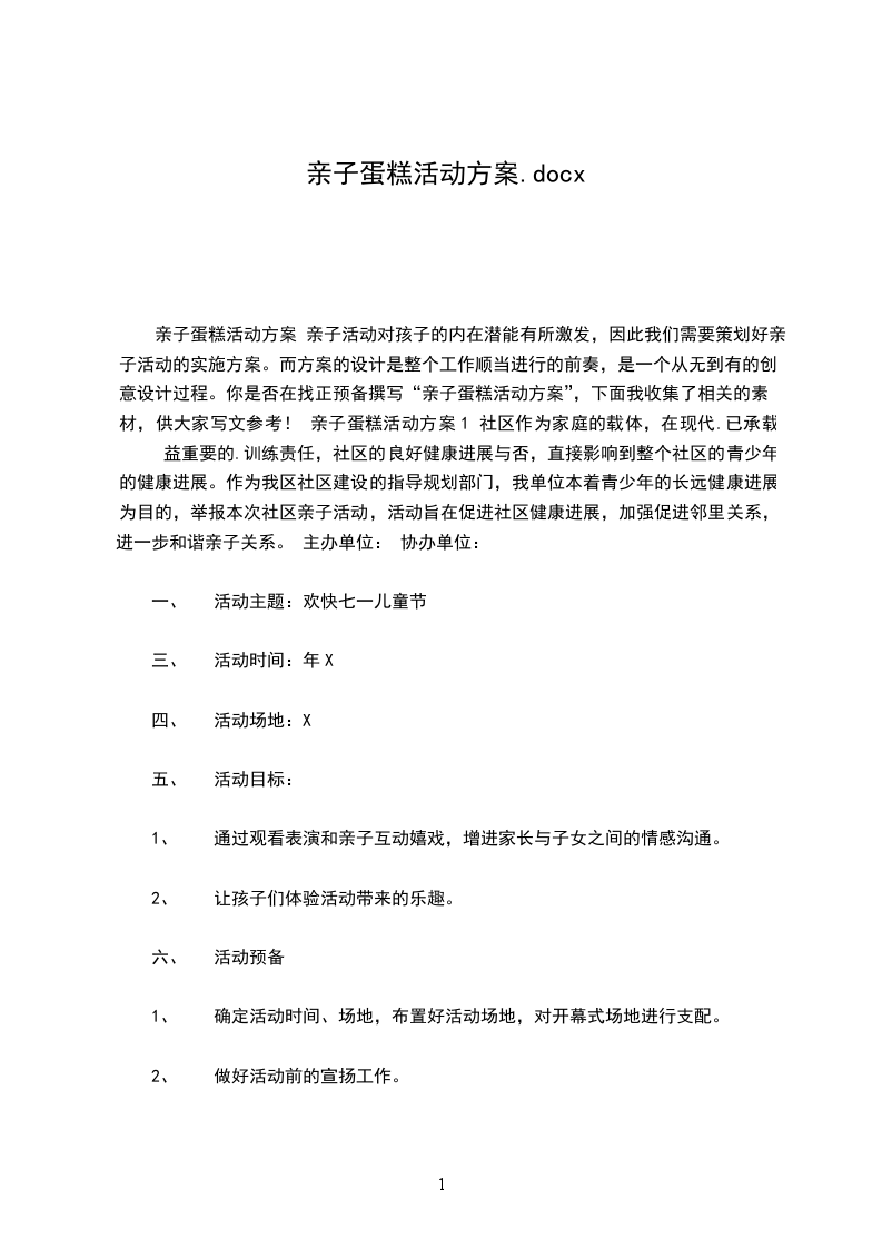 亲子蛋糕活动方案 亲子活动对孩子的内在潜能有所激发,因此我们需要策划好亲子活动的实施方案。而方案的设计是整个工作顺当进行的前奏,是一个从无到有的创意设计过程。你是否在找正预备撰写“亲子蛋糕活动方案”,下面我收集了相关的素材,供大家写文参考! 亲子蛋糕活动方案1 社区作为家庭的载体,在现代.已承载 益重要的.训练责任,社区的良好健康进展与否,直接影响到整个社区的青少年的健康进展。作为我区社区建设的指导规划部门,我单位本着青少年的长远健康进展为目的,举报本次社区亲子活动,活动旨在促进社区健康进展,加强促进邻里关系,进一步和谐亲子关系。 主办单位: 协办单位: