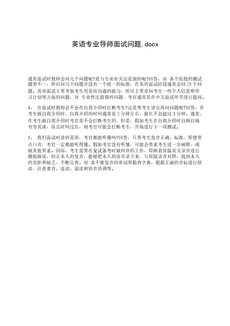 通常面试时教师会问几个问题呢?是与专业有关还是别的呢?回答:由 各个院校的测试题型不一,所以问几个问题并没有一个统一的标准,在英语面试阶段通常会问25个问题。英语面试主要考察考生用英语沟通的能力,所以主要是问考生一些个人信息和学习计划等方面的问题,对 专业性比拟强的问题,考官通常是在中文面试环节进行提问。