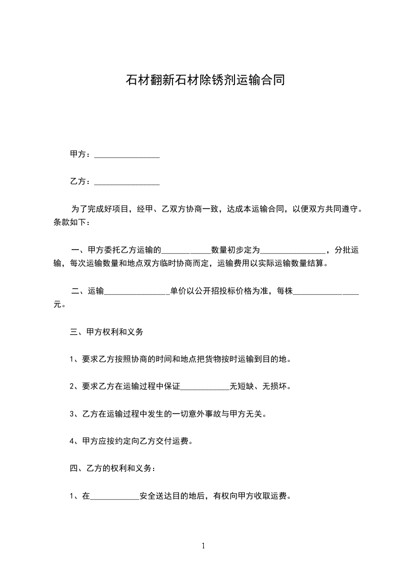 一、甲方委托乙方运输的____________数量初步定为________________,分批运输,每次运输数量和地点双方临时协商而定,运输费用以实际运输数量结算。