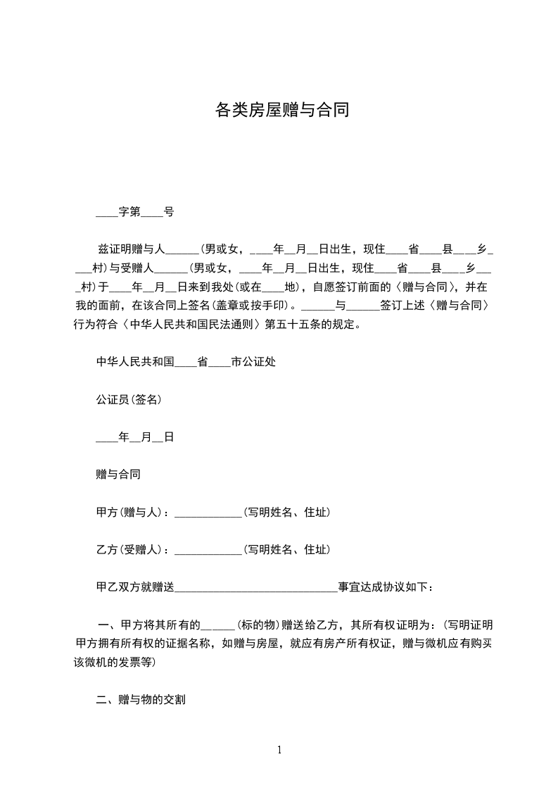 一、甲方将其所有的______(标的物)赠送给乙方,其所有权证明为:(写明证明甲方拥有所有权的证据名称,如赠与房屋,就应有房产所有权证,赠与微机应有购买该微机的发票等)