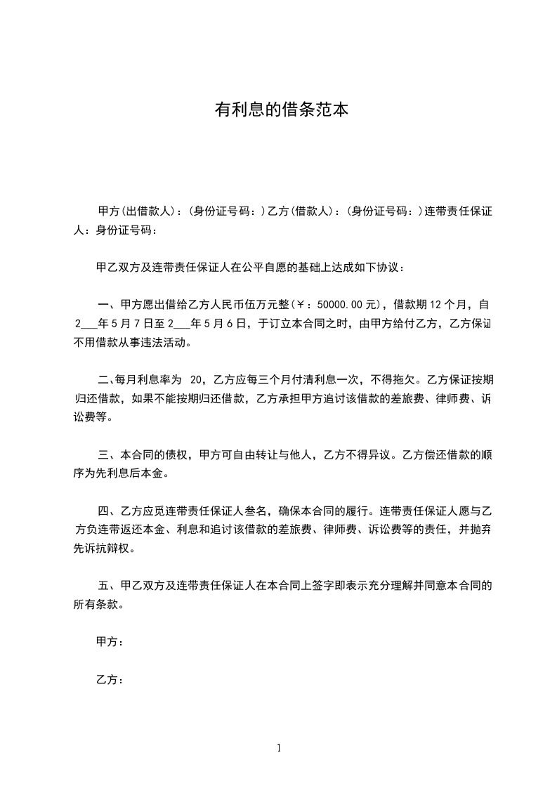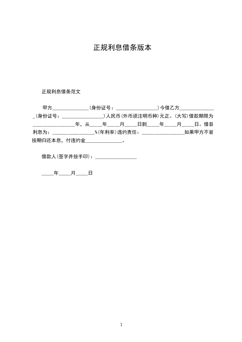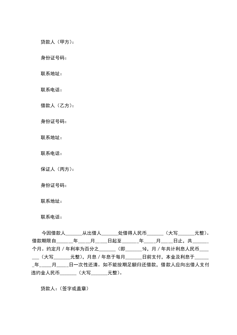 今因借款人_______从出借人_______处借得人民币_______(大写_______元整)。借款期限自_______年_____月_____日起至_______年_____月_____日止,共_______个月。约定月/年利率为百分之_______(即_______%),月/年共计利息人民币_______(大写_______元整),月息/年息于每月_______日前支付,本金及利息于_______年_____月_____日一次性还清。如不能按期足额归还借款,借款人应向出借人支付违约金人民币_______(大写_______元整)。
