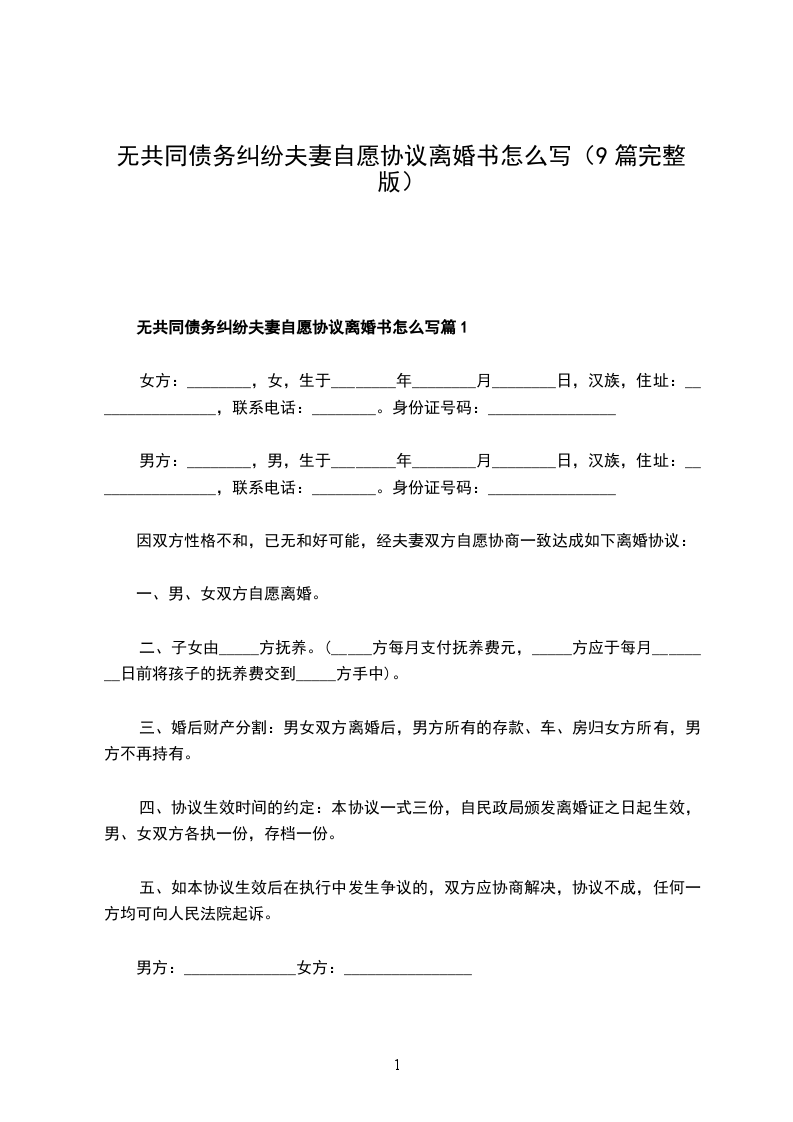 无共同债务纠纷自愿协议离婚范本格式篇9