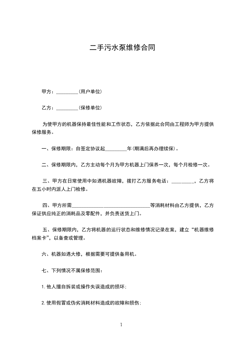 二手污水泵维修合同