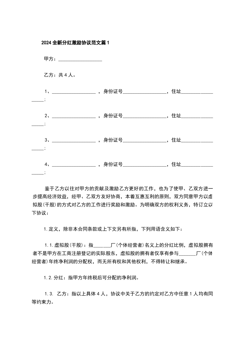 2.4乙方任意1人或多人提前终止与甲方的劳动关系或者乙方违反劳动合同或甲方的规章制度而被甲方解职的,或者其他任何因为甲方或乙方原因而使乙方离职的,基于本协议的奖励性质,双方认可:乙方中任意1人或多人离开甲方,则本协议对乙方已离职的具体个人自动失效,对乙方其他在职人员继续有效。如前一年已进行了分红,前一年的分红不用退还,但当年的分红不再分配给乙方已离职的具体个人,其分配比例归甲方所有,乙方其余人仍按每人9%,不足1.5万元的按10%的比例进行分配。甲方会在乙方有人离职的情况下,选择新的符合条件的人加入奖励行列,尽量使乙方人数长期维持在4人。如有新人加入,则甲方和乙方重新签订与本协议内容相同的新协议,仅在乙方具体名字上有所变更,若有其他变更则以新协议所述为准。