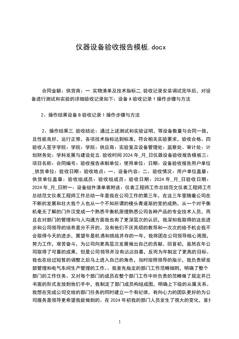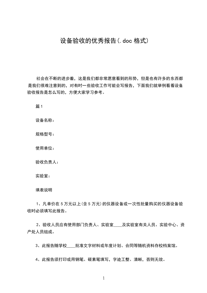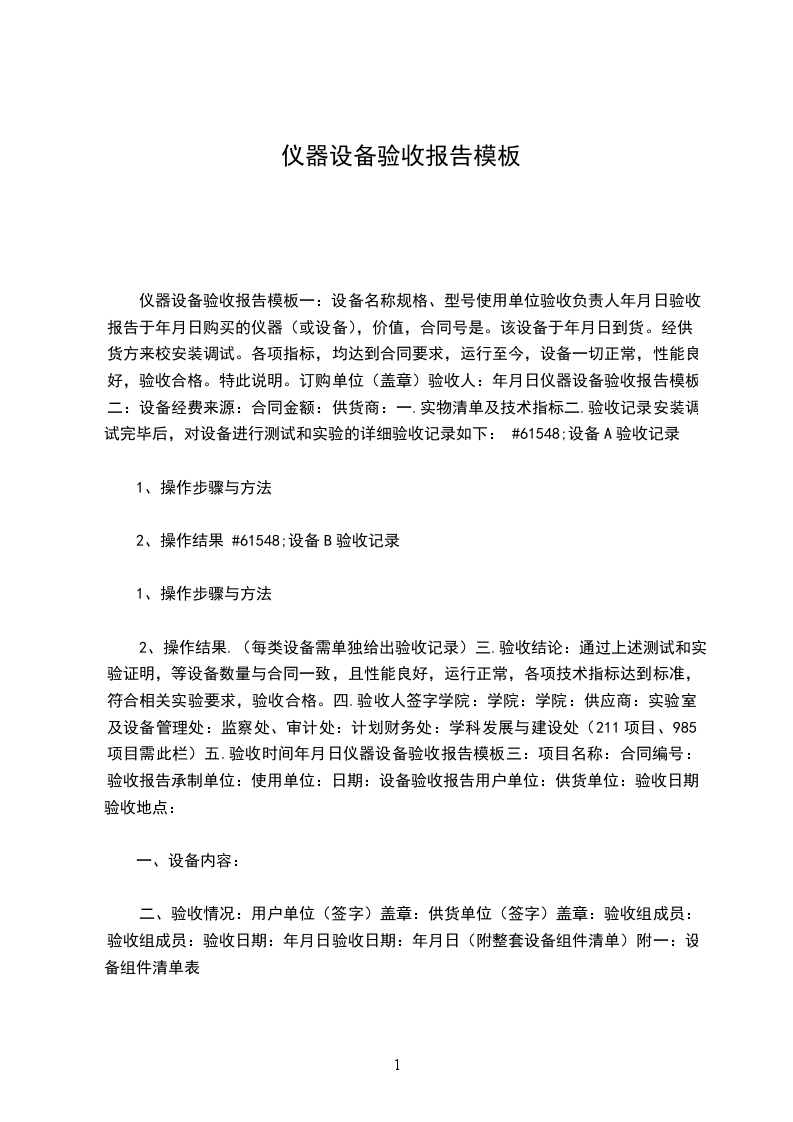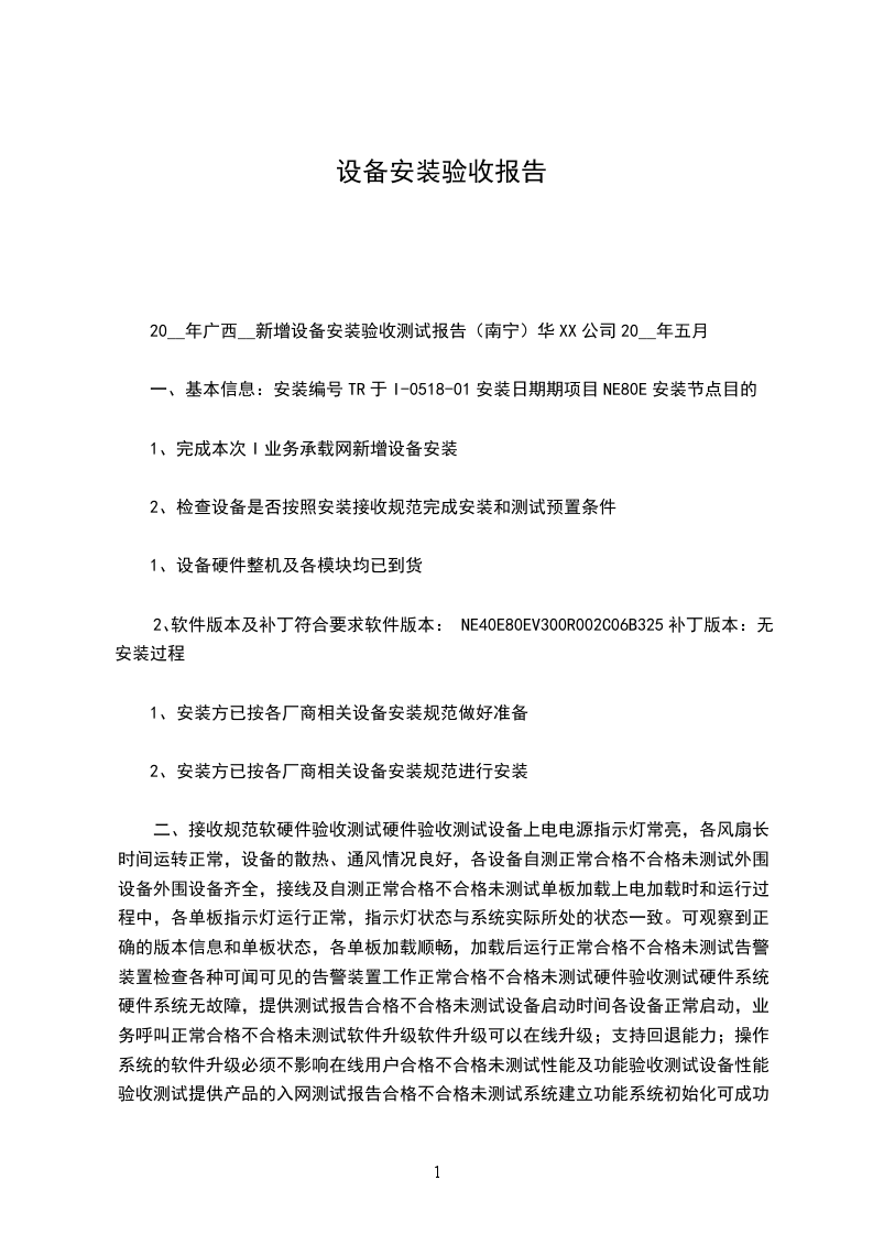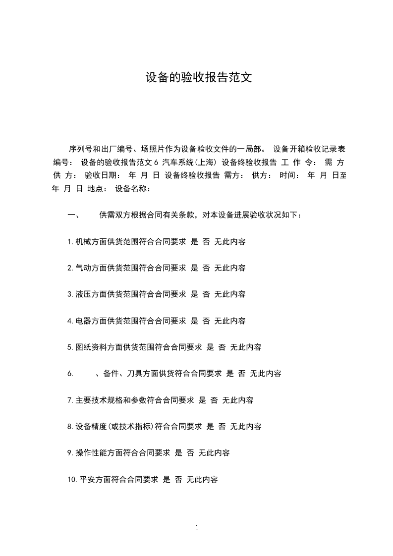 序列号和出厂编号、场照片作为设备验收文件的一局部。 设备开箱验收记录表 编号: 设备的验收报告范文6 汽车系统(上海) 设备终验收报告 工 作 令: 需 方: 供 方: 验收日期: 年 月 日 设备终验收报告 需方: 供方: 时间: 年 月 日至 年 月 日 地点: 设备名称: