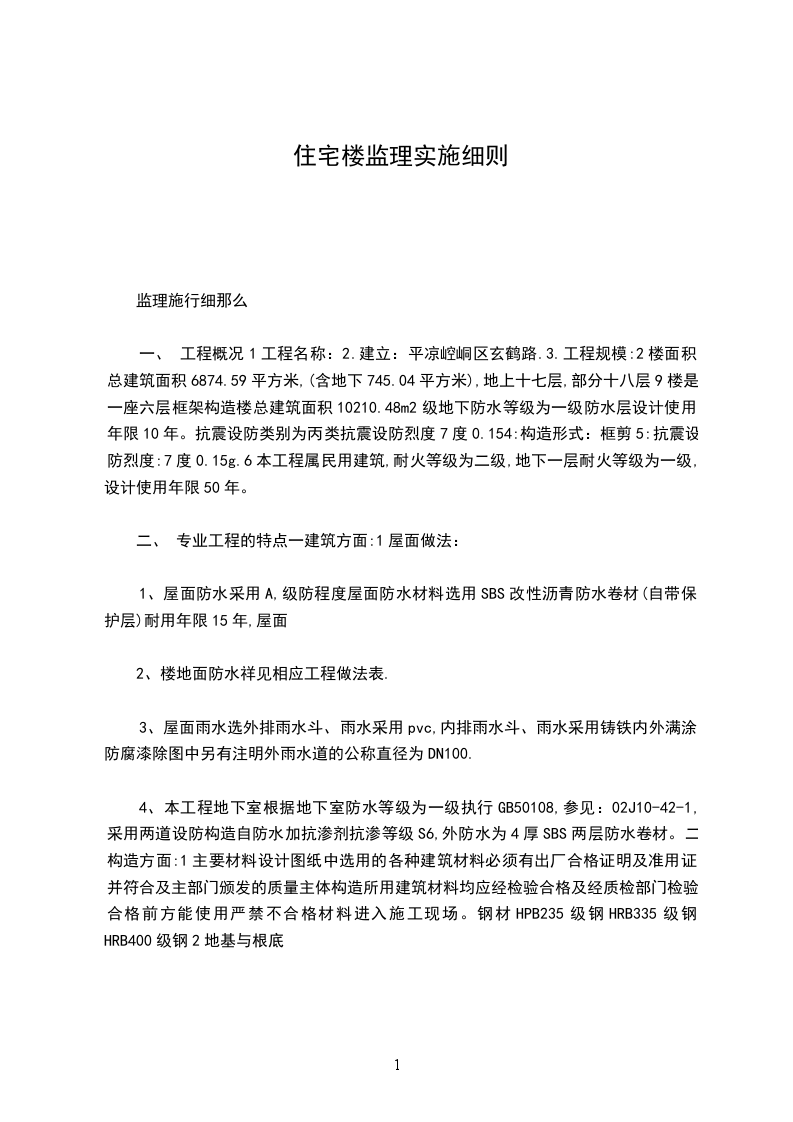 一、 工程概况1工程名称:2.建立:平凉崆峒区玄鹤路.3.工程规模:2楼面积总建筑面积6874.59平方米,(含地下745.04平方米),地上十七层,部分十八层9楼是一座六层框架构造楼总建筑面积10210.48m2级地下防水等级为一级防水层设计使用年限10年。抗震设防类别为丙类抗震设防烈度7度0.154:构造形式:框剪5:抗震设防烈度:7度0.15g.6本工程属民用建筑,耐火等级为二级,地下一层耐火等级为一级,设计使用年限50年。