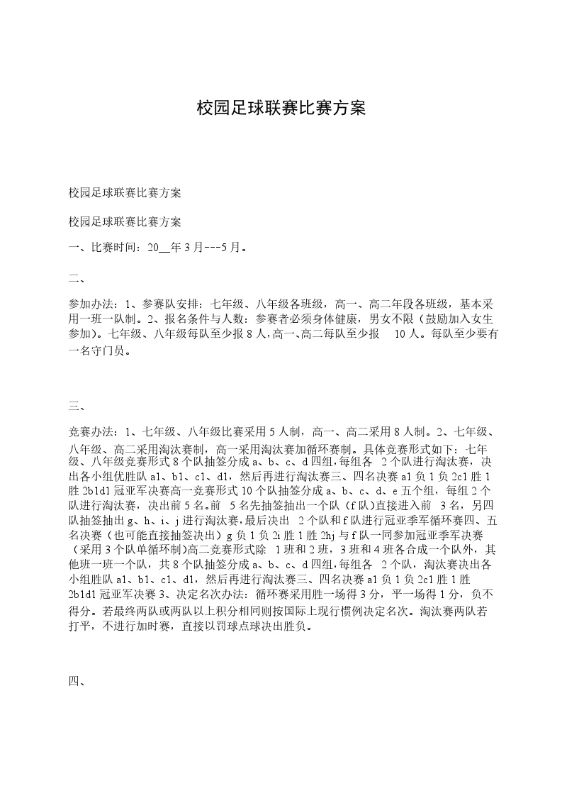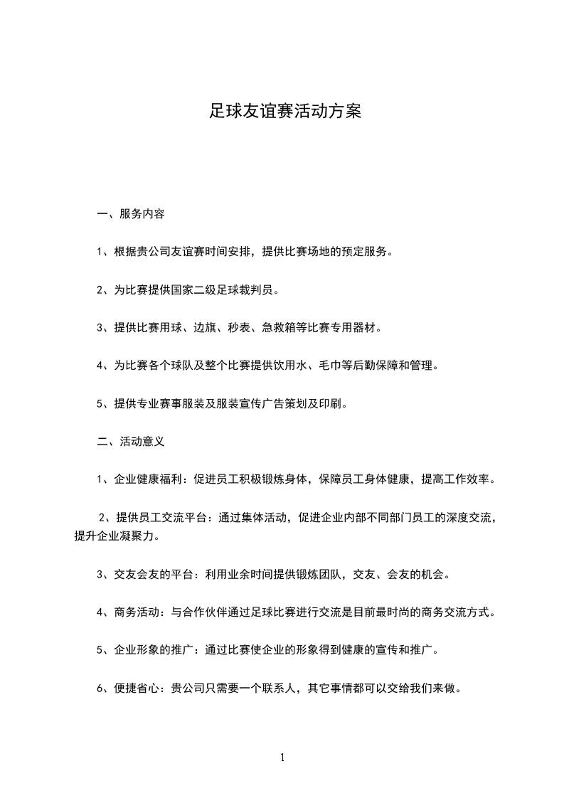 足球赛活动方案一、主题:赛出风格超越自我全力以赴团队协作二、活动时间:三、活动地点:四、主办单位:承办单位:五、活动的目的:为了弘扬拼搏精神,倡导健康生活,努力营造健康和谐的生活,促进全体员工相互学习和交流,培养团队协作精神,提高员工身体素质和足球水平,特举办此次足球联赛六、比赛形式和规则:、球队:以各队办为单位联合组成,每个队办各出一支队伍(每支队伍1015人)。每场上场8名球员,每场有5个换人名额【换人必须经过当值主裁判允许方可上场,另外换下的球员不可以再次上场比赛。】、拉拉队:每支队伍必须有一支拉拉队,在比赛期间为自家足球队呐喊助威,由裁判组待足球赛活动结束后投票选出最具活力足球拉拉队,发奖状嘉奖。、比赛时间:245分钟,中场休息十分钟.、比赛形式:5支队伍循环赛,按积分排名(胜积3分,平积1分,输积0分)、比赛规则:见附录一
