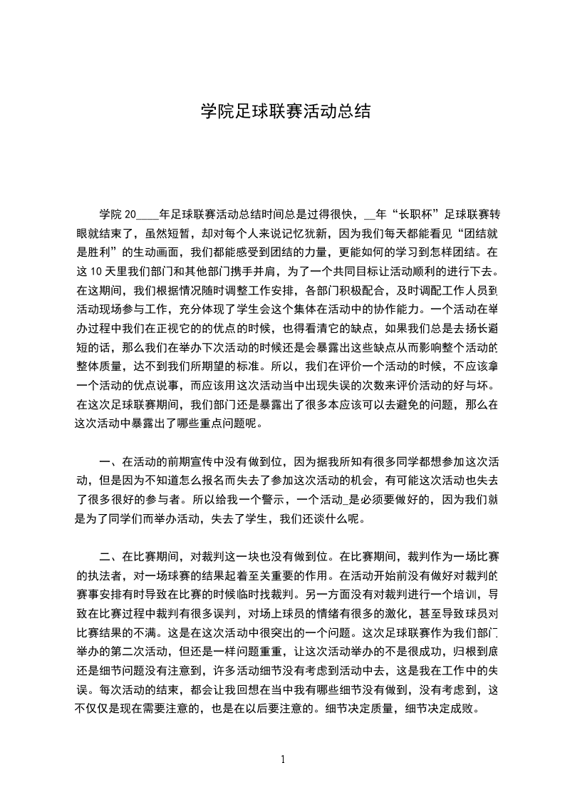(3)网络宣传:在上发布足球赛活动信息.十、经费预算【待各队伍和赛事安排妥当,确定经费】项目价格(元)单位合计(元)宣传工作(海报)3奖杯1奖旗2证书5足球5哨子5球网1奖品总经费十一:附件附件一:足球赛比赛规则附件二:足球赛赛程安排及积分排名附件三:足球赛进球记录表附件一:足球赛比赛规则1)开赛前通过掷币方法分出开球方及进攻方向,下半场要交换场地,参赛球队要有统一服装和编号,两支队伍应该有所区别。2)比赛中所有队员不得辱骂殴打裁判、对方参赛队员及工作人员,一经发现,其所在球队将被取消参赛资格。3)比赛中若某队故意中断比赛,超过10分钟即视为罢赛,罢赛队以0:3判负。罢赛队伍不积分,另一支队伍积三分。4)比赛中若一队不足5人时则终止比赛,判该队0:3负。5)比赛得分均按国际足联规则执行.6)所有参赛队必须在比赛开始前10分钟到达比赛场地,各参赛队如超过规定开球时间10分钟仍未到场,视为弃权处理并发公告通报批评,判对方3:0胜。7)比赛细则及相关判罚,必须以场上主裁判的判断为准。8)吃牌球员由主裁判记录在红黄牌上统一交给第四裁判统一记录。9)比赛红黃牌累计计算,一张红牌自然停赛一场,累計两张黄牌自然停赛一场。10)每场只可换5名球员,换下场的球员不可再次上场.11)禁止穿铁钉足球鞋。12)裁判分为主裁判一个,边裁两个,第四裁判一名(第四裁判负责监督和换人)。比赛过程中以主裁判判罚为标准。特殊情况可以与其他裁判商议决定。附件二:足球赛赛程安排及积分排名一、足球赛按照循环赛制举行,所有参赛队伍分成五个专业队,每支队伍参加4场比赛,最终按积分排名。场次比赛时间对阵双方裁判123XXXX8910二、积分排名一队二队三队四队五队进球总数失球总数净胜球数积分名次一队二队三队四队五队附件三:足球赛进球记录表甲队:乙队:分数:分数:号码进球红黄牌号码进球红黄牌队长签名:甲队:乙队:比赛时间:注:本表一经填写,不得随意更改,如发现冒名顶替者按竞赛规程严肃处理。