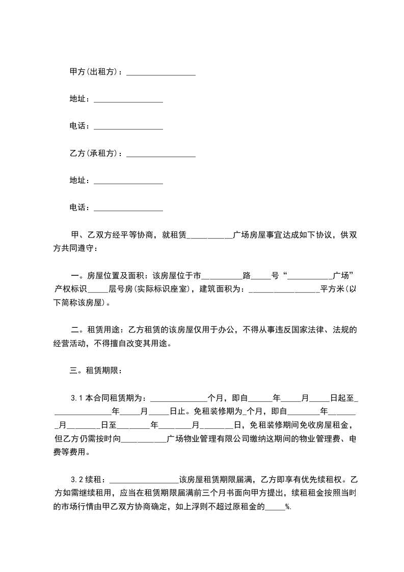 二、房屋起付日期和租赁期限1、房屋装修、设备安装日期_______________个月,自________________月______日起,至___________月___________日止。装修期间免收租费。2、房屋租赁自___________年______月______日起,至__________年__________月__________日止。租赁期________________年。3、租赁期满,甲方有权收回出租房屋,乙方应如期归还,乙方需继续承租的,应于租赁期满前三个月,向甲方提出书面要求,经甲方同意后重新签订租赁合同。同等条件下,乙方享有优先租赁权。