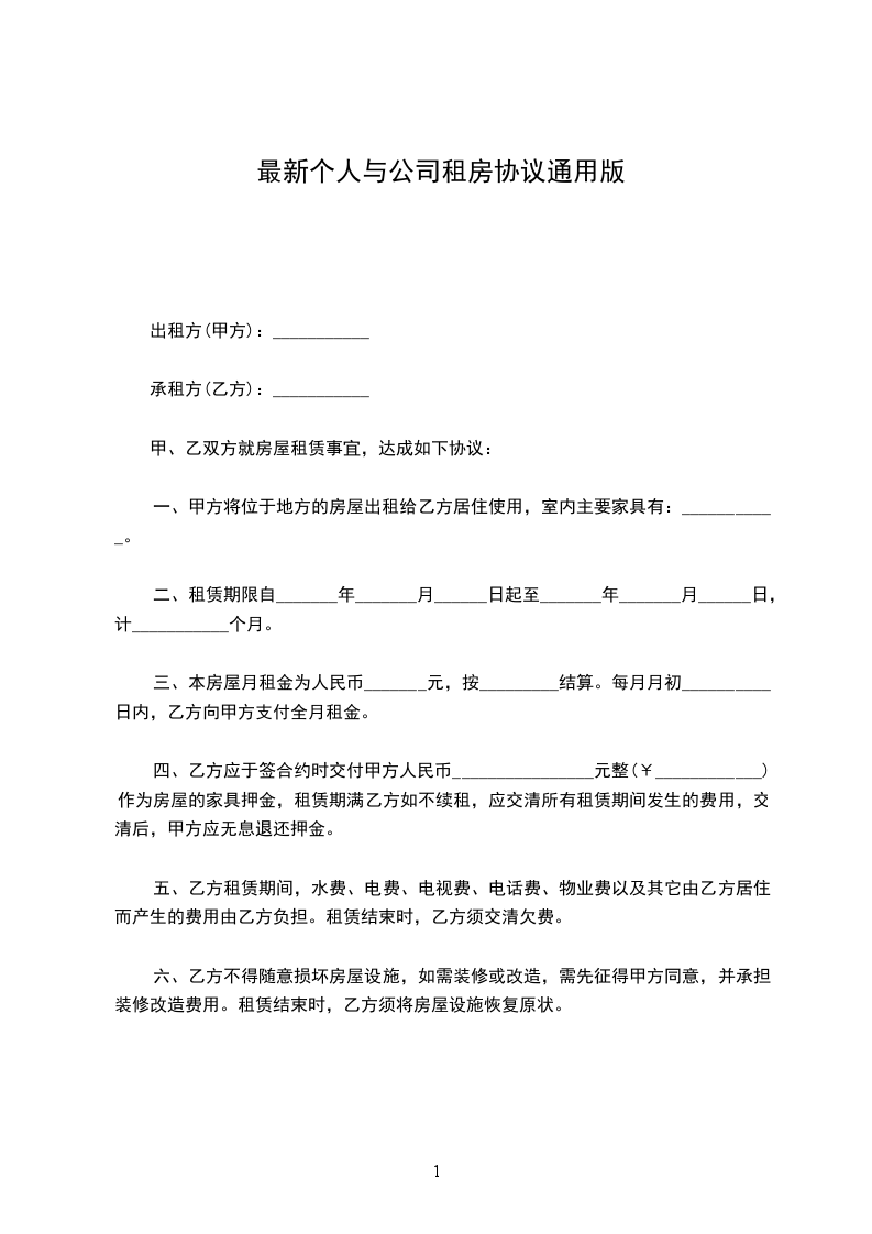 一、出租房屋情况甲方出租给乙方的房屋座落在_______________,租赁建筑面积为________________平方米。房屋类型为________________结构。