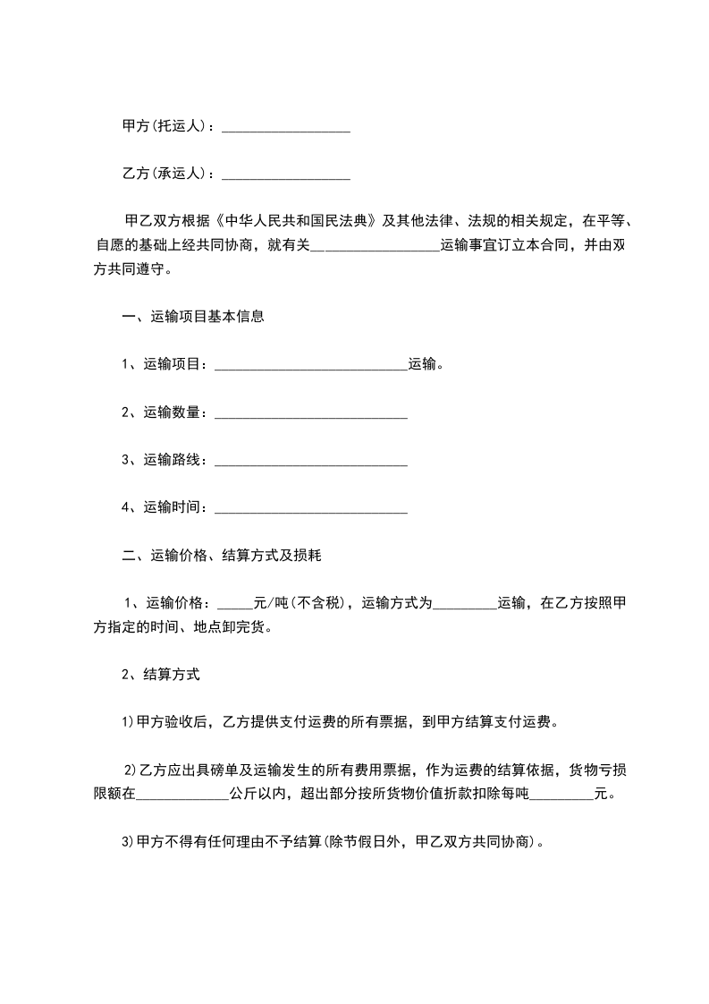 一、甲方委托乙方运输的____________数量初步定为________________,分批运输,每次运输数量和地点双方临时协商而定,运输费用以实际运输数量结算。