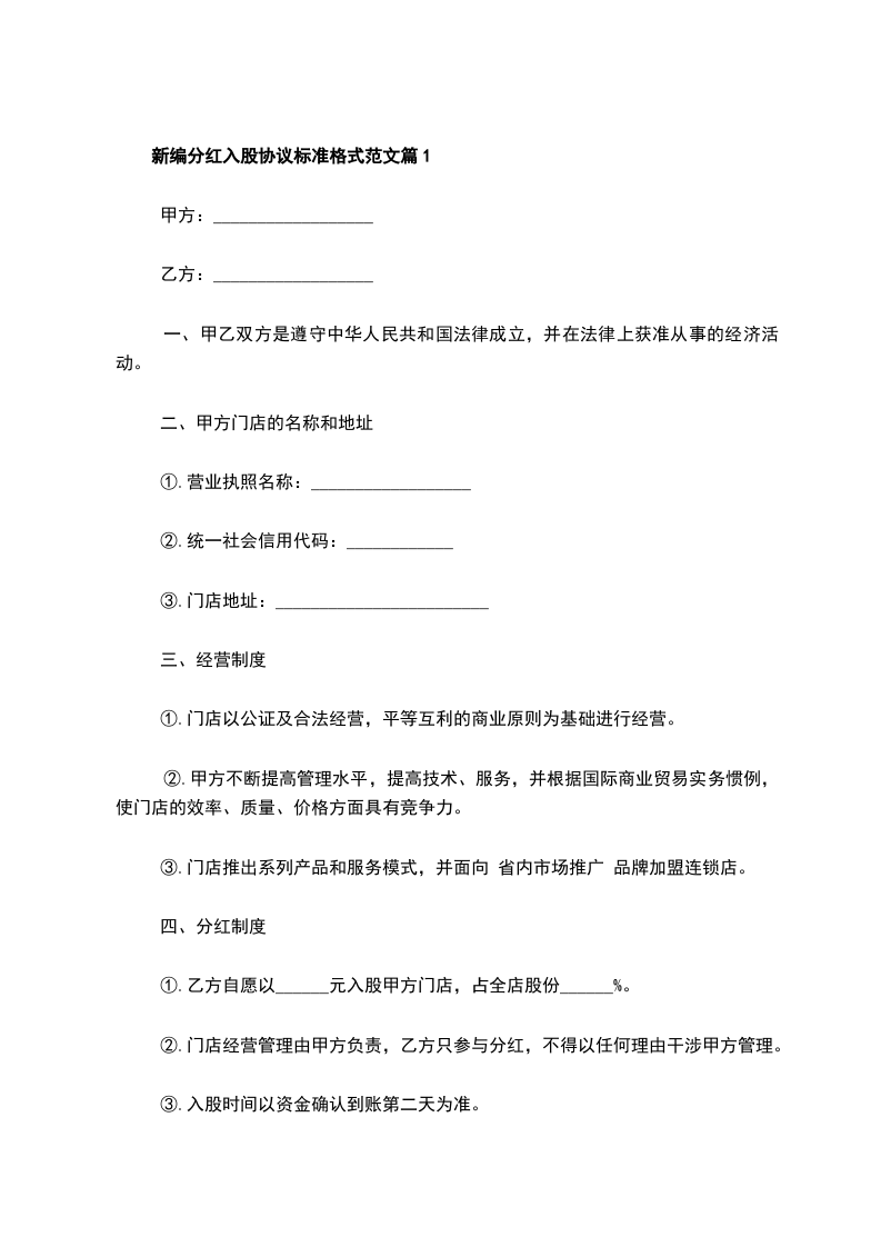 新编分红入股协议标准格式范文篇1