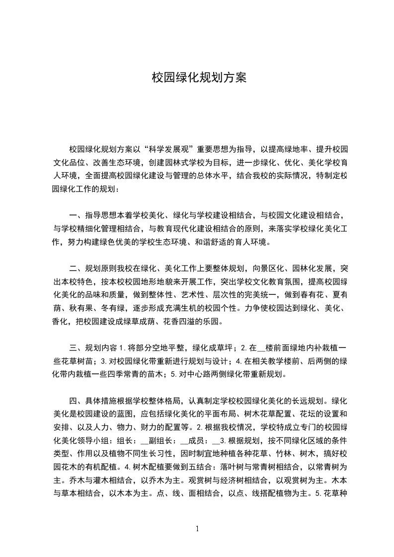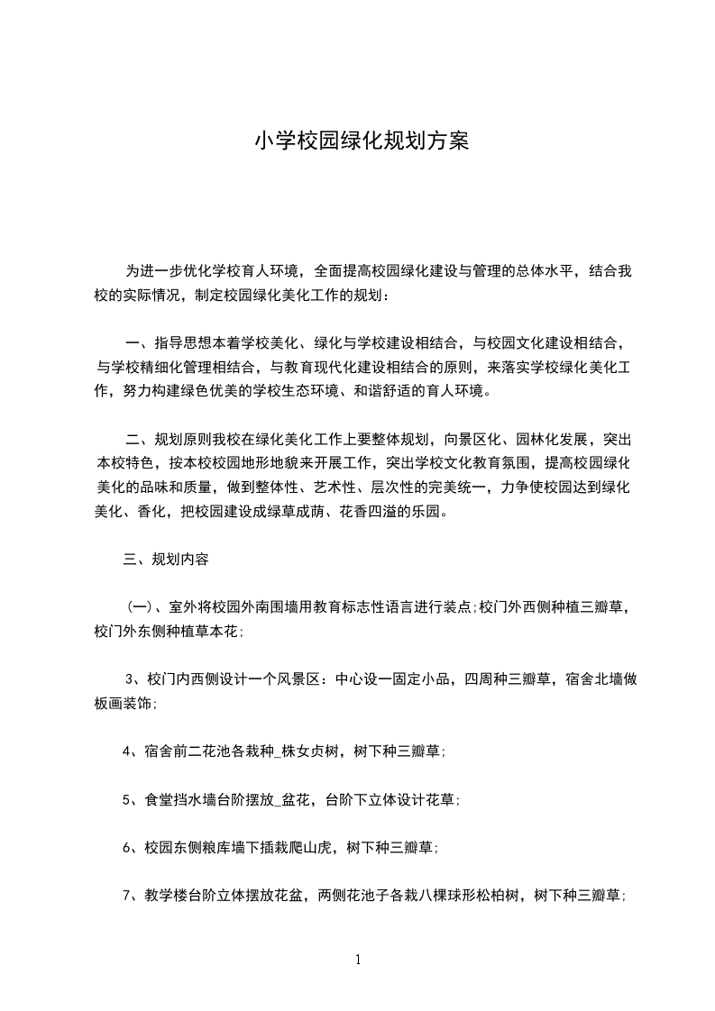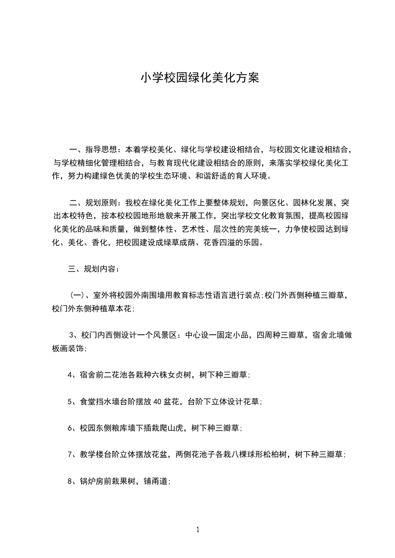 四、具体措施根据学校整体格局,认真制定学校校园绿化美化的长远规划。绿化美化是校园建设的蓝图,应包括绿化美化的平面布局、树木花草配置、花坛的设置和安排、以及人力、物力、财力的配置等。根据规划,按不同绿化区域的条件、类型、作用以及植物不同生长习性,因地制宜、因时制宜地种植各种花草、树木,搞好校园花木的有机配植。树木配植要做到五结合:落叶树与常青树相结合,以常青树为主。乔木与灌木相结合,以乔木为主。观赏树与经济树相结合,以观赏树为主。木本与草本相结合,以木本为主。点、线、面相结合,以点、线搭配植物为主。花草种植要做到配植合理,还要做到四季常青,四季花香。广植树、盆花。在搞好校园绿化美化的同时,利用盆花易搬动的特点,搞好学校办公室、会议室、教室等室内的绿化美化,以便让师生们在紧张的学习和工作中,得以减轻劳累、疲倦,使室内也充满盎然的生机,从而实现其观赏的价值。同时组织师生参加绿化美化活动。搞好校园花木的维护保养,做到“四要”:即春要栽、夏要剪、秋要管、冬要保,还要做到适时施肥、施水、防治病虫害,适时修剪等,从而达到绿化美化校园的目的。7绿化管理人员要不断提高花木培植技术和管理水平,认真履行职责,不仅要做到勤于培植,还要搞好科学管理。8对损坏花草树木的相关人员,按实际损坏的情况予以赔偿。9建立学校绿化档案,对学校绿地精心测量,对树木认真核对,登记造册。美丽的校园需要我们共同来维护,优美文明的环境需要我们共同来创设,让我们每一个人伸出双手,关心绿化、支持绿化,共同去创建绿色、文明、优美、和谐的校园环境和育人环境。