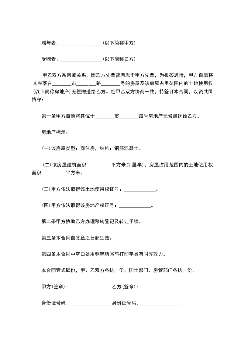 第一条甲方自愿将其位于________市________路号房地产无偿赠送给乙方。