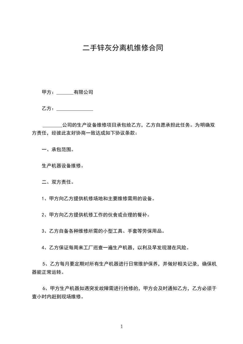 ________公司的生产设备维修项目承包给乙方,乙方自愿承担此任务。为明确双方责任,经彼此友好协商一致达成如下协议条款: