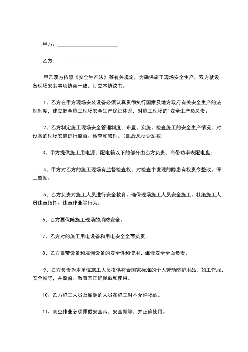 2、乙方制定施工现场安全管理制度,布置、实施、检查施工的安全生产情况,对设备的现场安装进行监督、检查和管理。(自愿退股协议书)