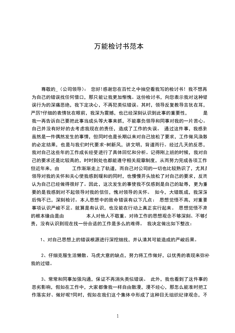 尊敬的_(公司领导): 您好!感谢您在百忙之中抽空看我写的检讨书! 我不想再为自己的错误找任何借口,那只能让我更加惭愧。这份检讨书,向您表示我对这种错误行为的深痛恶绝,我下定决心,不再犯类似错误。其时,领导反复教导言犹在耳,严厉?仔细的表情犹在眼前,我深为震撼,也已经深刻认识到此事的重要性, 是我一再告诉自己要把此事当成头等大事来抓,不能辜负领导和同事对我的一片苦心。 自己并没有好好的去考虑我现在的责任,造成了工作的失误。 通过这件事,我感到虽然是一件偶然发生的事情,但同时也是长期以来对自己放松了要求,工作做风涣散的必定结果,也是与我们时代要求-树新风,讲文明,背道而行。经过几天的反思,我对自己这些年的工作成长经受进行了具体回忆和分析。记得刚上班的时候,我对自己的要求还是比较高的,时时到处也都能遵守相关规章制度,从而努力完成各项工作。但近年来,由 工作渐渐走上了轨道,而自己对公司的一切也比较熟识了,尤其是领导对我的关怀和关心使我感到暖和的同时,也慢慢开头放松了对自己的要求,反而认为自己已经做得很好了。因此,这次发生的事使我不仅感到是自己的耻辱,更为重要的是我感到对不起领导对我的信任,愧对领导的关怀。 如今,大错既成,我深深后悔不已,深刻检讨。本人思想中的致命错误有以下几点: 思想觉悟不高,对重要事项认识严峻不足。就算是有认识,也没能在行动上真正实行起来。 思想觉悟不高的根本缘由是由 本人对他人不敬重。对待工作的思想观念不够深刻、不够负责,没有认识到现在找一份合适的工作是多么的难得。 我决定做出如下整改: