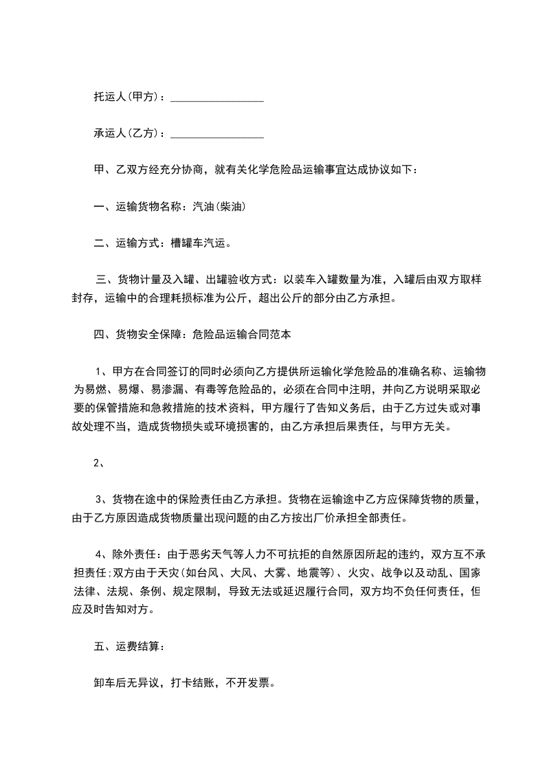 1、甲方在合同签订的同时必须向乙方提供所运输化学危险品的准确名称、运输物为易燃、易爆、易渗漏、有毒等危险品的,必须在合同中注明,并向乙方说明采取必要的保管措施和急救措施的技术资料,甲方履行了告知义务后,由于乙方过失或对事故处理不当,造成货物损失或环境损害的,由乙方承担后果责任,与甲方无关。