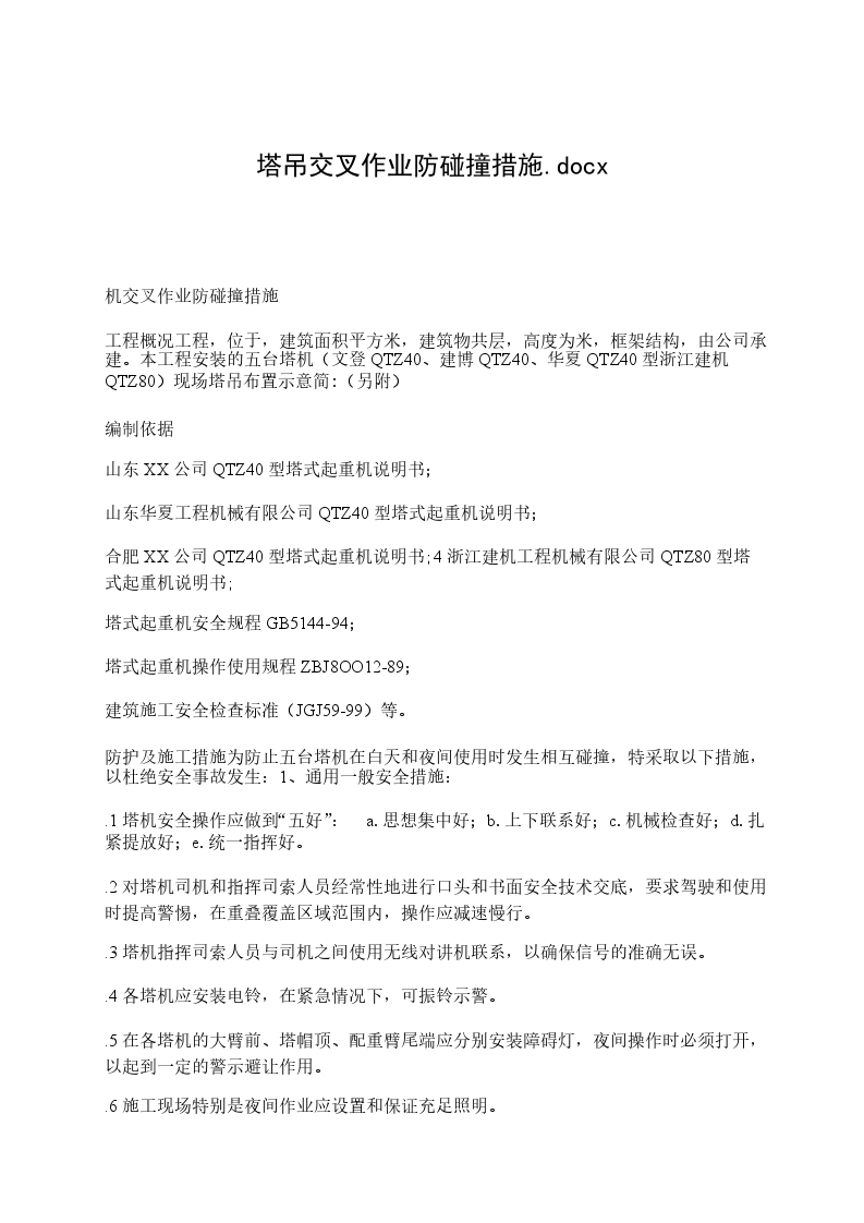 一、目的为了保证“__区”施工用2台塔吊在同一交叉作业区域内的安全,避免T