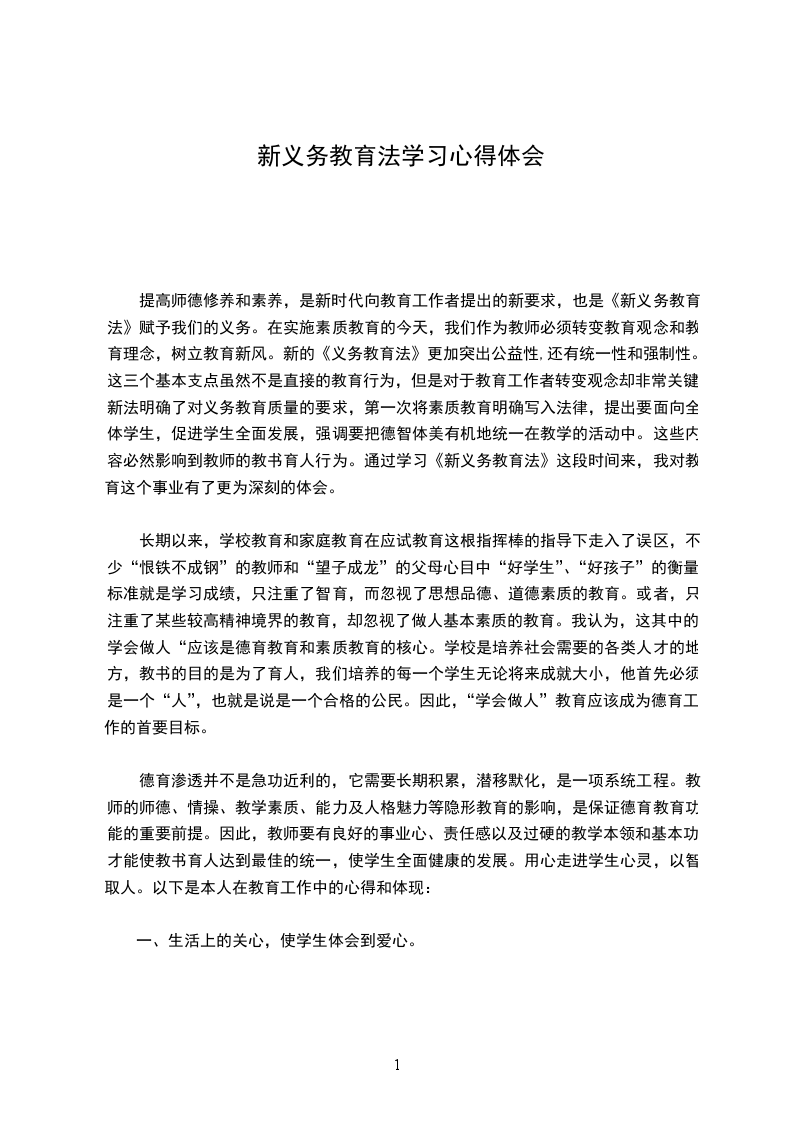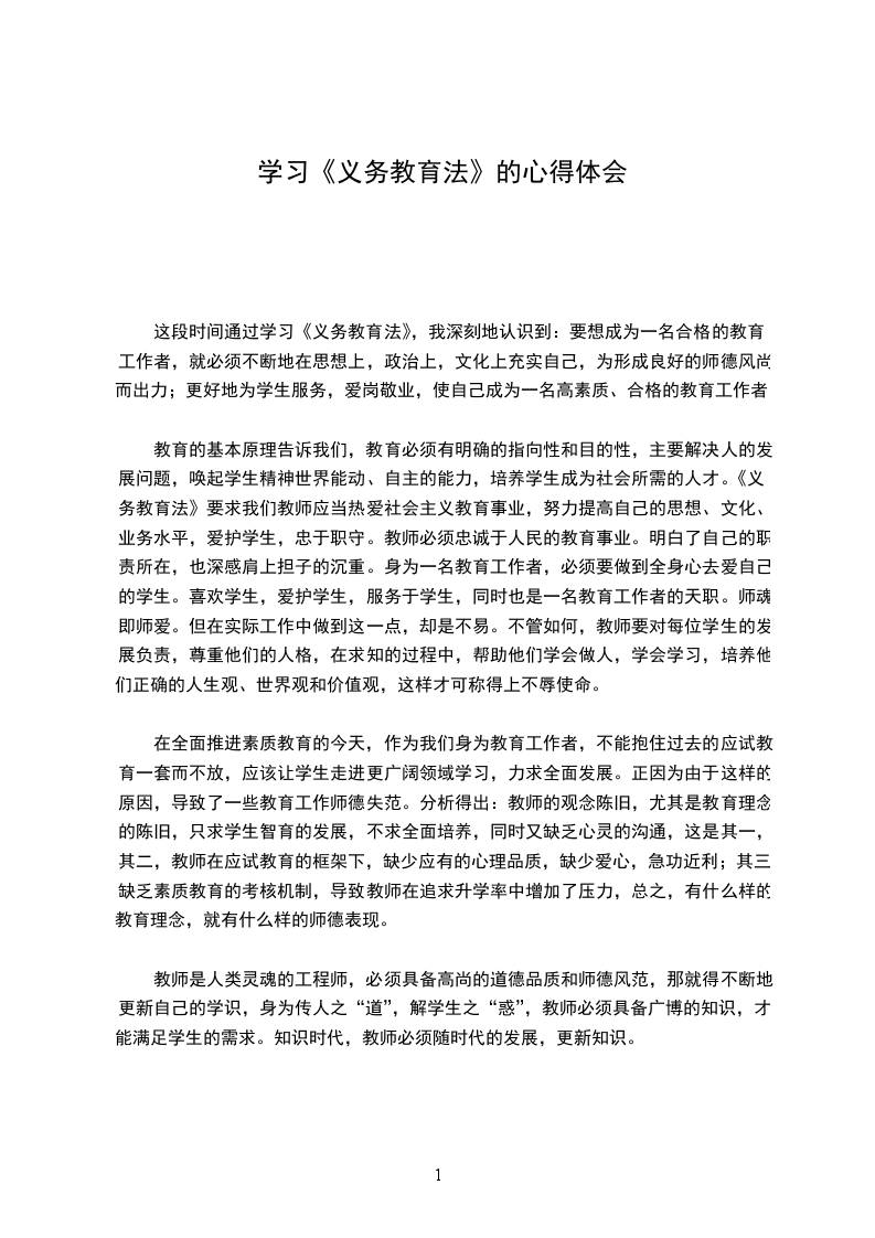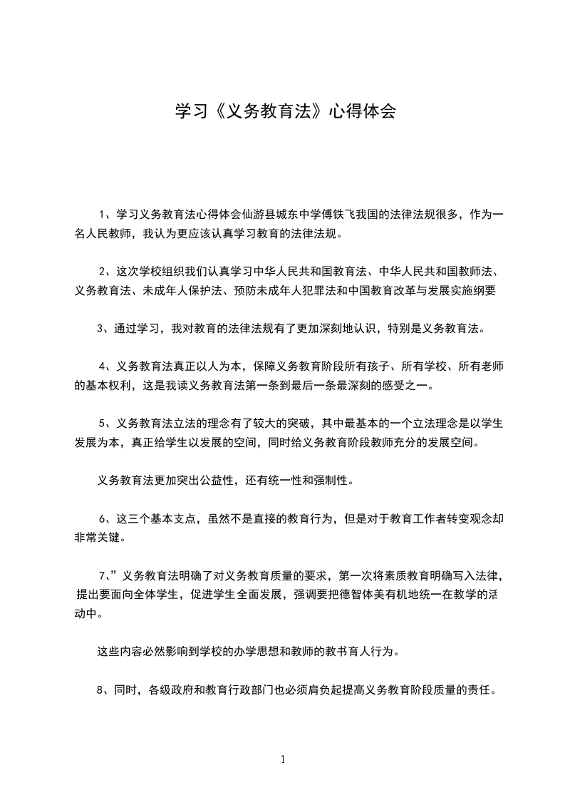 1、学习义务教育法心得体会仙游县城东中学傅铁飞我国的法律法规很多,作为一名人民教师,我认为更应该认真学习教育的法律法规。