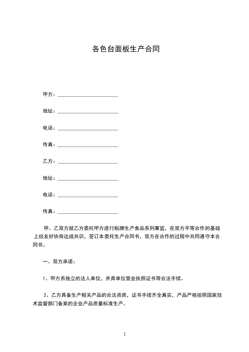 各色台面板生产合同