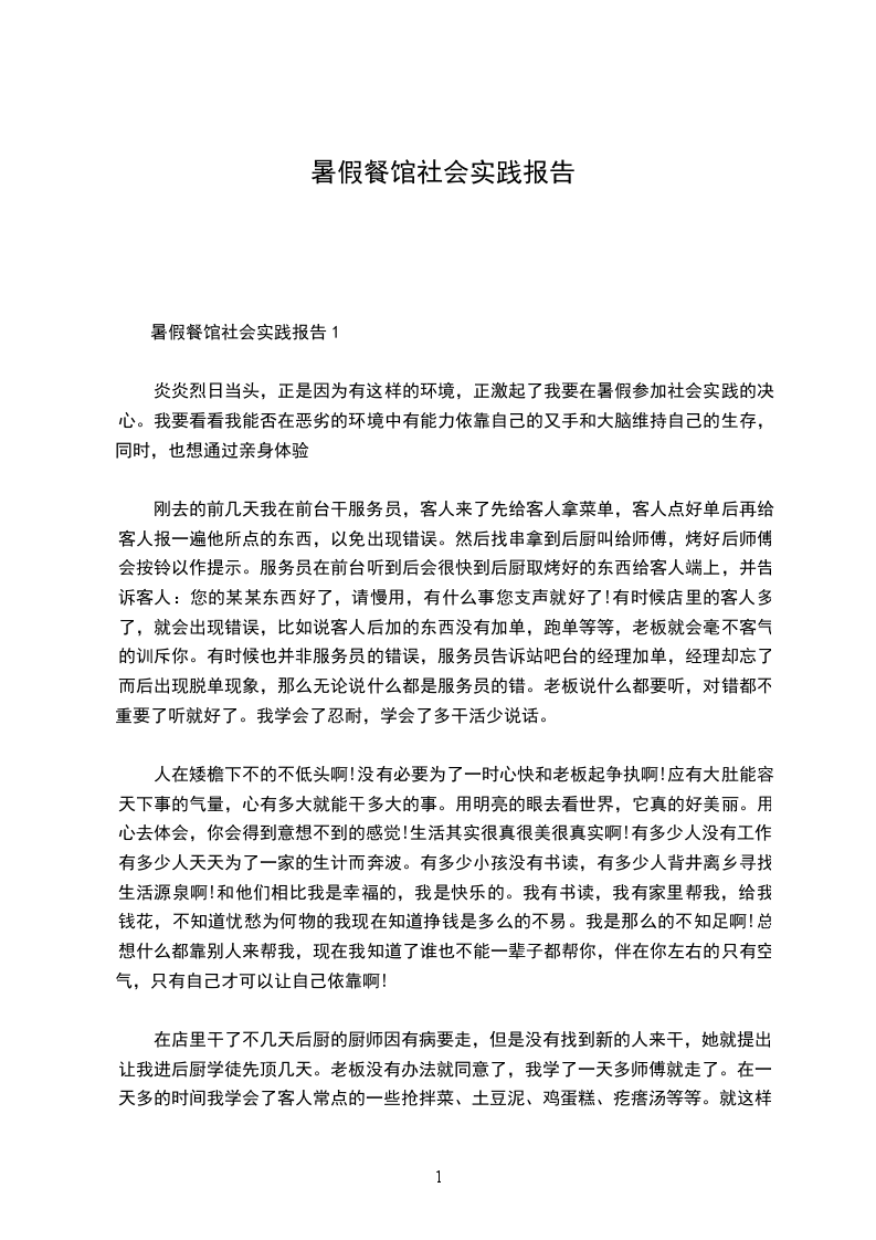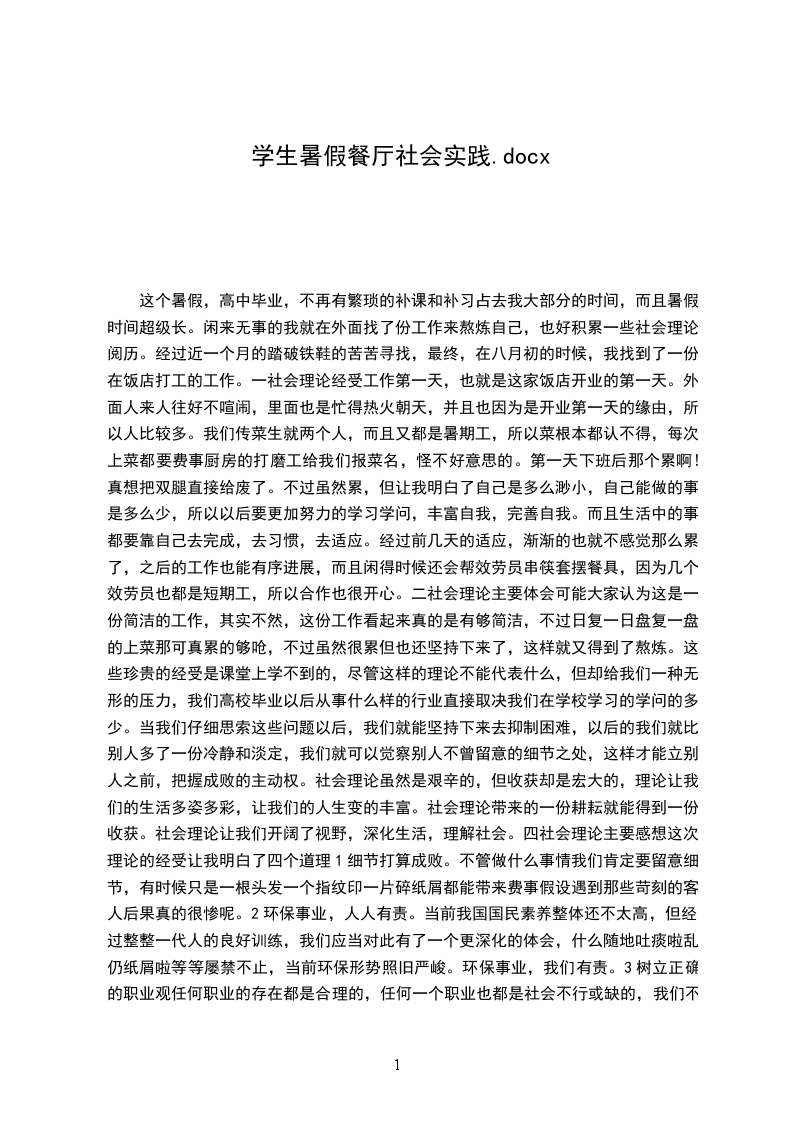 这个暑假,高中毕业,不再有繁琐的补课和补习占去我大部分的时间,而且暑假时间超级长。闲来无事的我就在外面找了份工作来熬炼自己,也好积累一些社会理论阅历。经过近一个月的踏破铁鞋的苦苦寻找,最终,在八月初的时候,我找到了一份在饭店打工的工作。一社会理论经受工作第一天,也就是这家饭店开业的第一天。外面人来人往好不喧闹,里面也是忙得热火朝天,并且也因为是开业第一天的缘由,所以人比较多。我们传菜生就两个人,而且又都是暑期工,所以菜根本都认不得,每次上菜都要费事厨房的打磨工给我们报菜名,怪不好意思的。第一天下班后那个累啊!真想把双腿直接给废了。不过虽然累,但让我明白了自己是多么渺小,自己能做的事是多么少,所以以后要更加努力的学习学问,丰富自我,完善自我。而且生活中的事都要靠自己去完成,去习惯,去适应。经过前几天的适应,渐渐的也就不感觉那么累了,之后的工作也能有序进展,而且闲得时候还会帮效劳员串筷套摆餐具,因为几个效劳员也都是短期工,所以合作也很开心。二社会理论主要体会可能大家认为这是一份简洁的工作,其实不然,这份工作看起来真的是有够简洁,不过日复一日盘复一盘的上菜那可真累的够呛,不过虽然很累但也还坚持下来了,这样就又得到了熬炼。这些珍贵的经受是课堂上学不到的,尽管这样的理论不能代表什么,但却给我们一种无形的压力,我们高校毕业以后从事什么样的行业直接取决我们在学校学习的学问的多少。当我们仔细思索这些问题以后,我们就能坚持下来去抑制困难,以后的我们就比别人多了一份冷静和淡定,我们就可以觉察别人不曾留意的细节之处,这样才能立别人之前,把握成败的主动权。社会理论虽然是艰辛的,但收获却是宏大的,理论让我们的生活多姿多彩,让我们的人生变的丰富。社会理论带来的一份耕耘就能得到一份收获。社会理论让我们开阔了视野,深化生活,理解社会。四社会理论主要感想这次理论的经受让我明白了四个道理1细节打算成败。不管做什么事情我们肯定要留意细节,有时候只是一根头发一个指纹印一片碎纸屑都能带来费事假设遇到那些苛刻的客人后果真的很惨呢。2环保事业,人人有责。当前我国国民素养整体还不太高,但经过整整一代人的良好训练,我们应当对此有了一个更深化的体会,什么随地吐痰啦乱仍纸屑啦等等屡禁不止,当前环保形势照旧严峻。环保事业,我们有责。3树立正确的职业观任何职业的存在都是合理的,任何一个职业也都是社会不行或缺的,我们不能卑视别人的职业。当然,我们也要有一个好的职业规划,我们得明白:迈出高校校内的我们面临的竞争压力仍旧很大,就业形势照旧严峻。这次理论活动肯定会成为我人生的一笔宏大财宝,它将鼓舞着我,踏实做人,仔细做事,并且英勇地面对生活的困难和挫折,用微笑去迎接每一天。