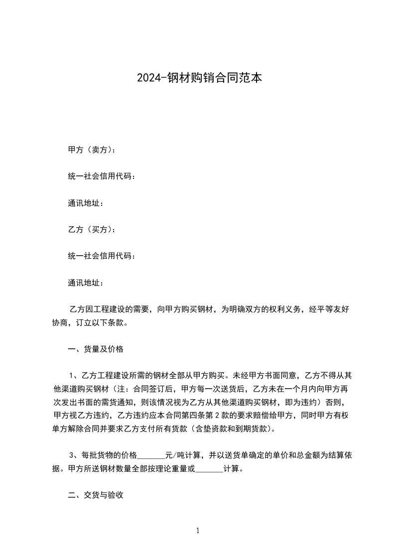 乙方因工程建设的需要,向甲方购买钢材,为明确双方的权利义务,经平等友好协商,订立以下条款。