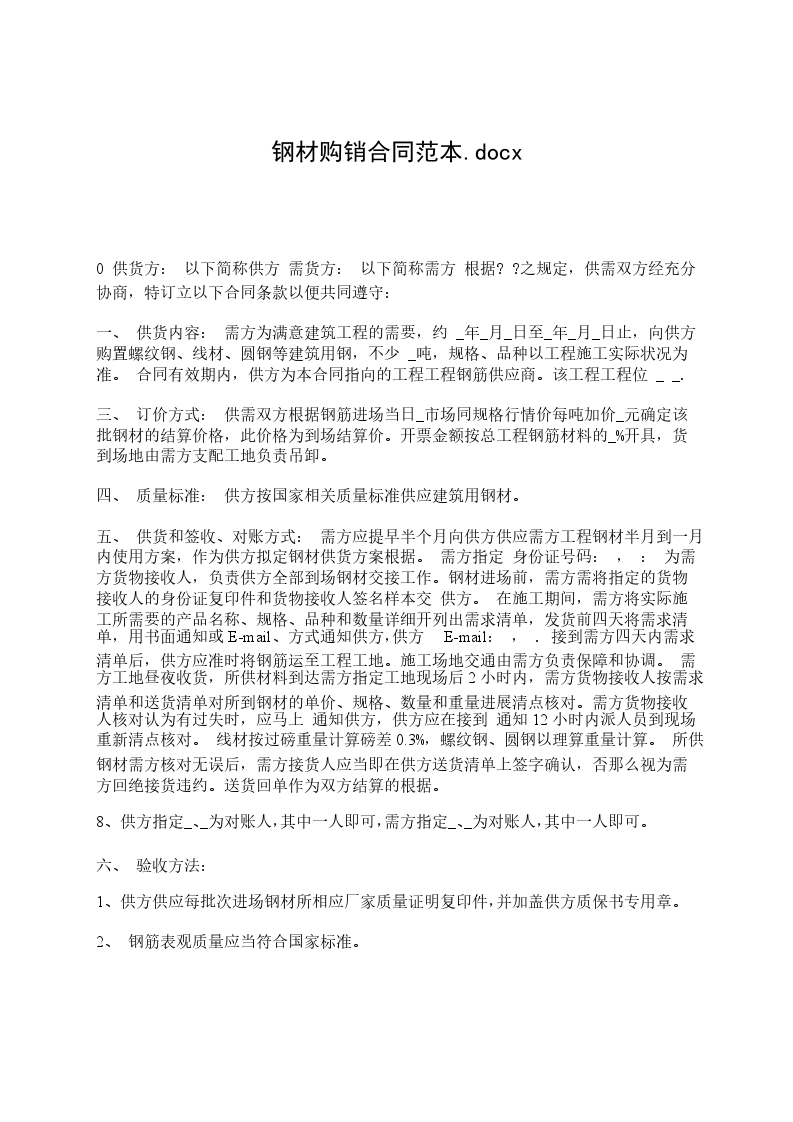 1、乙方的工程于_______年_______月_______日开始至_______年_______月_______日结束,这期间总计钢材用量为_______吨全由甲方供货。