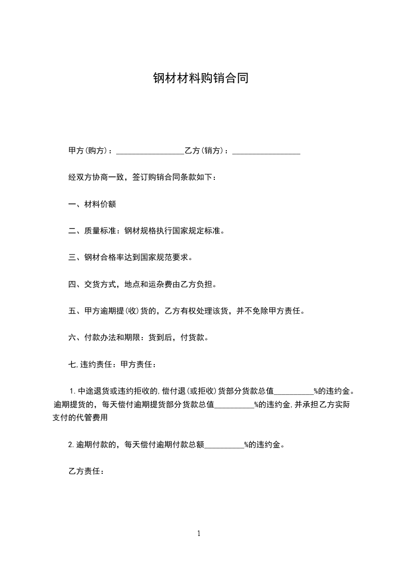 1、乙方工程建设所需的钢材全部从甲方购买。未经甲方书面同意,乙方不得从其他渠道购买钢材(注:合同签订后,甲方每一次送货后,乙方未在一个月内向甲方再次发出书面的需货通知,则该情况视为乙方从其他渠道购买钢材,即为违约)否则,甲方视乙方违约,乙方违约应本合同第四条第2款的要求赔偿给甲方,同时甲方有权单方解除合同并要求乙方支付所有货款(含垫资款和到期货款)。