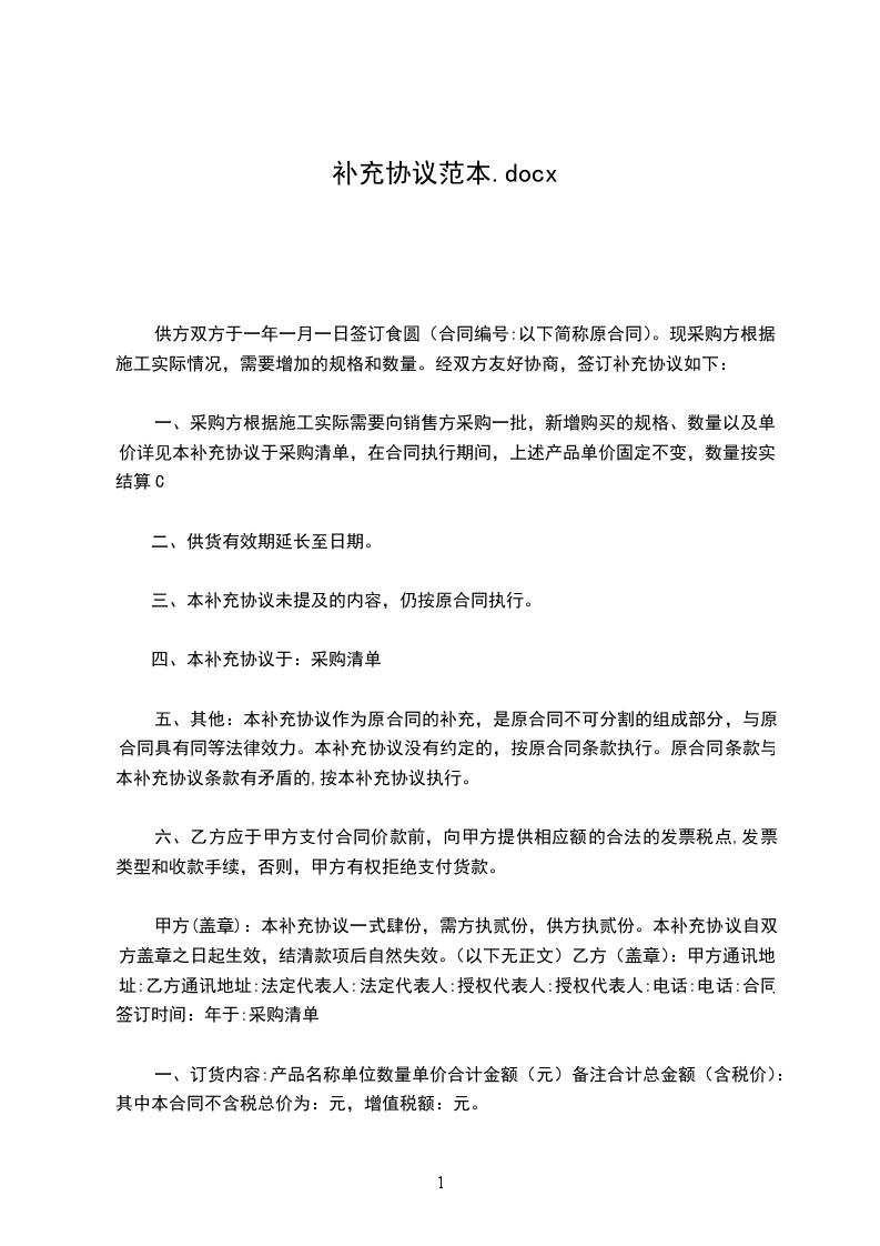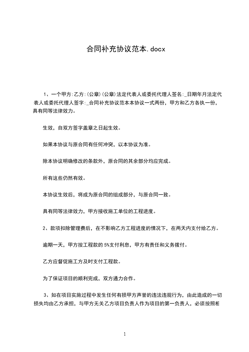 1、一个甲方:乙方:(公章)(公章)法定代表人或委托代理人签名:_日期年月法定代表人或委托代理人签字:_合同补充协议范本本协议一式两份,甲方和乙方各执一份,具有同等法律效力。