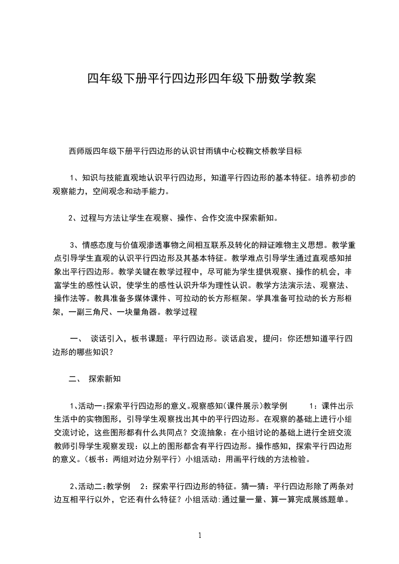 西师版四年级下册平行四边形的认识甘雨镇中心校鞠文桥教学目标