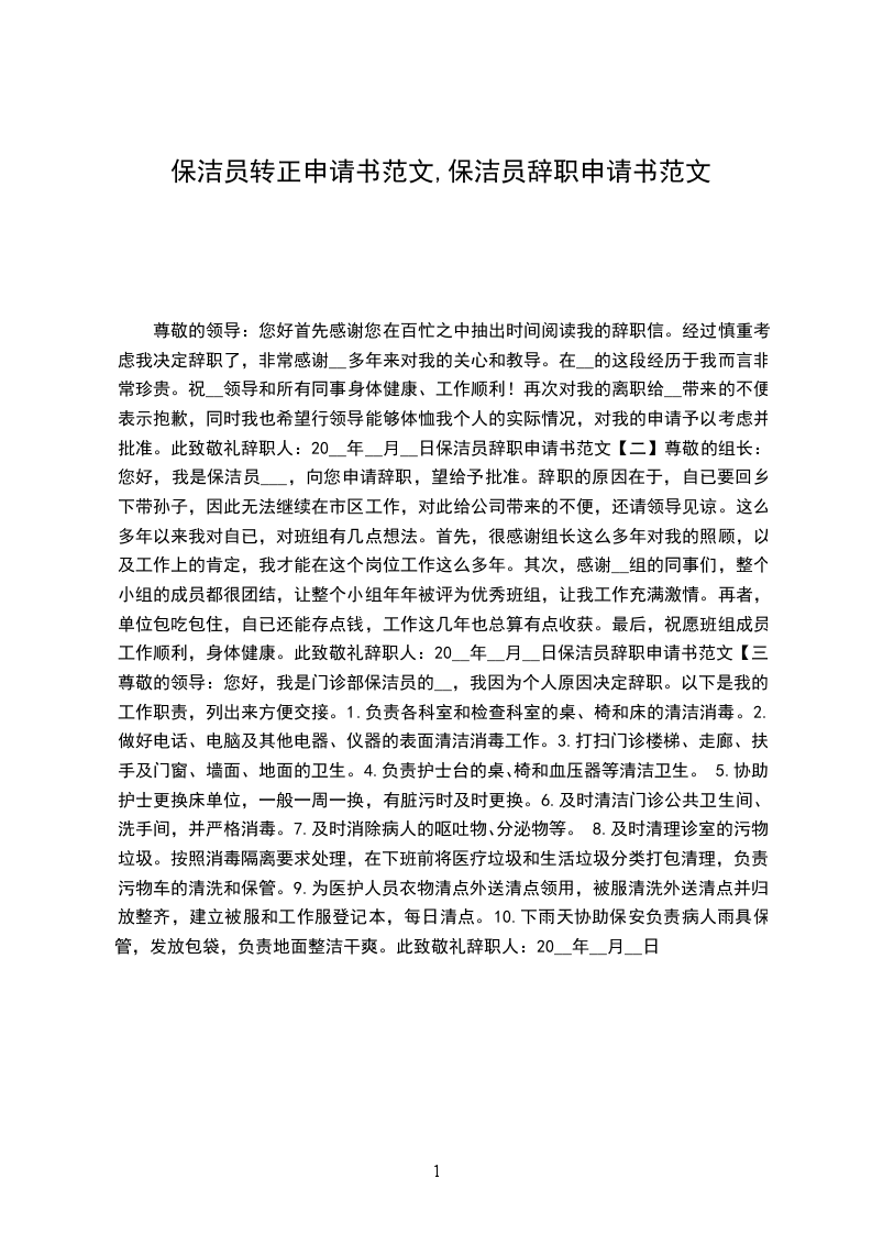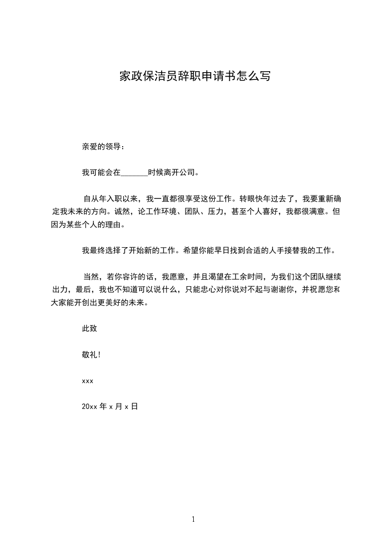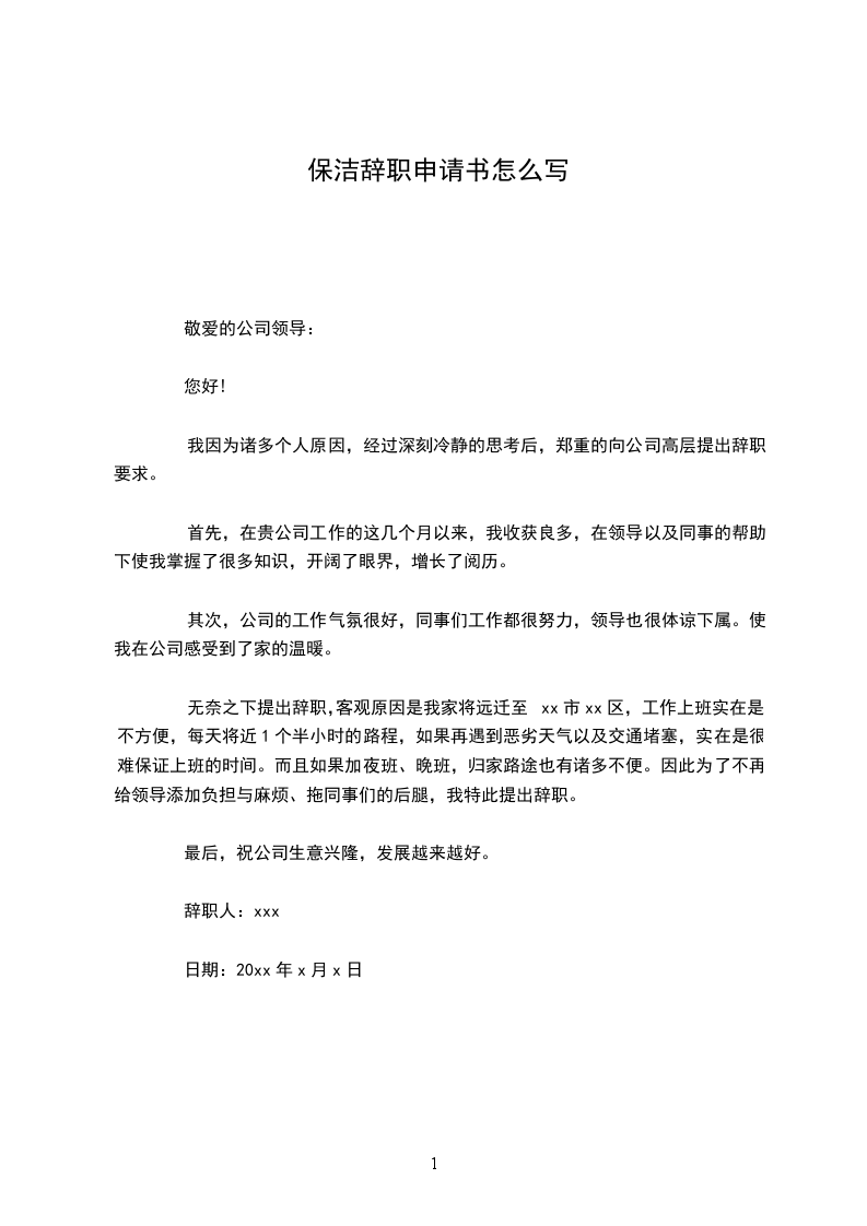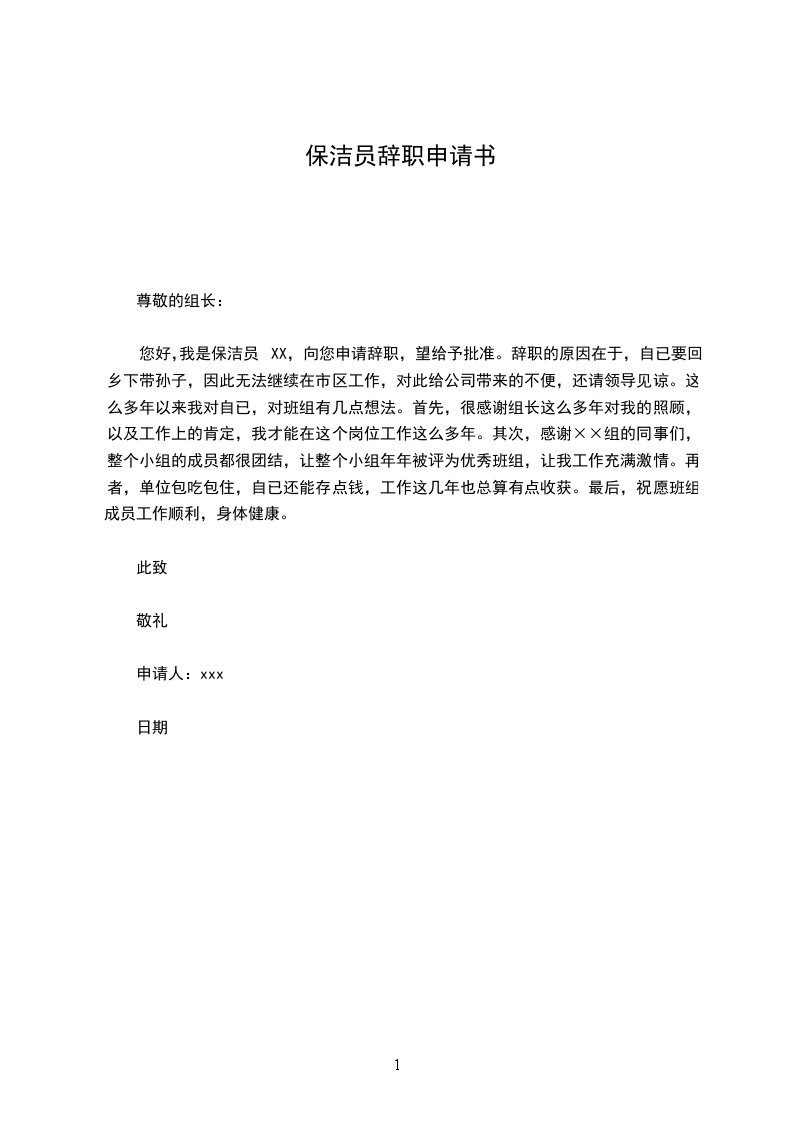 您好,我是保洁员XX,向您申请辞职,望给予批准。辞职的原因在于,自已要回乡下带孙子,因此无法继续在市区工作,对此给公司带来的不便,还请领导见谅。这么多年以来我对自已,对班组有几点想法。首先,很感谢组长这么多年对我的照顾,以及工作上的肯定,我才能在这个岗位工作这么多年。其次,感谢××组的同事们,整个小组的成员都很团结,让整个小组年年被评为优秀班组,让我工作充满激情。再者,单位包吃包住,自已还能存点钱,工作这几年也总算有点收获。最后,祝愿班组成员工作顺利,身体健康。