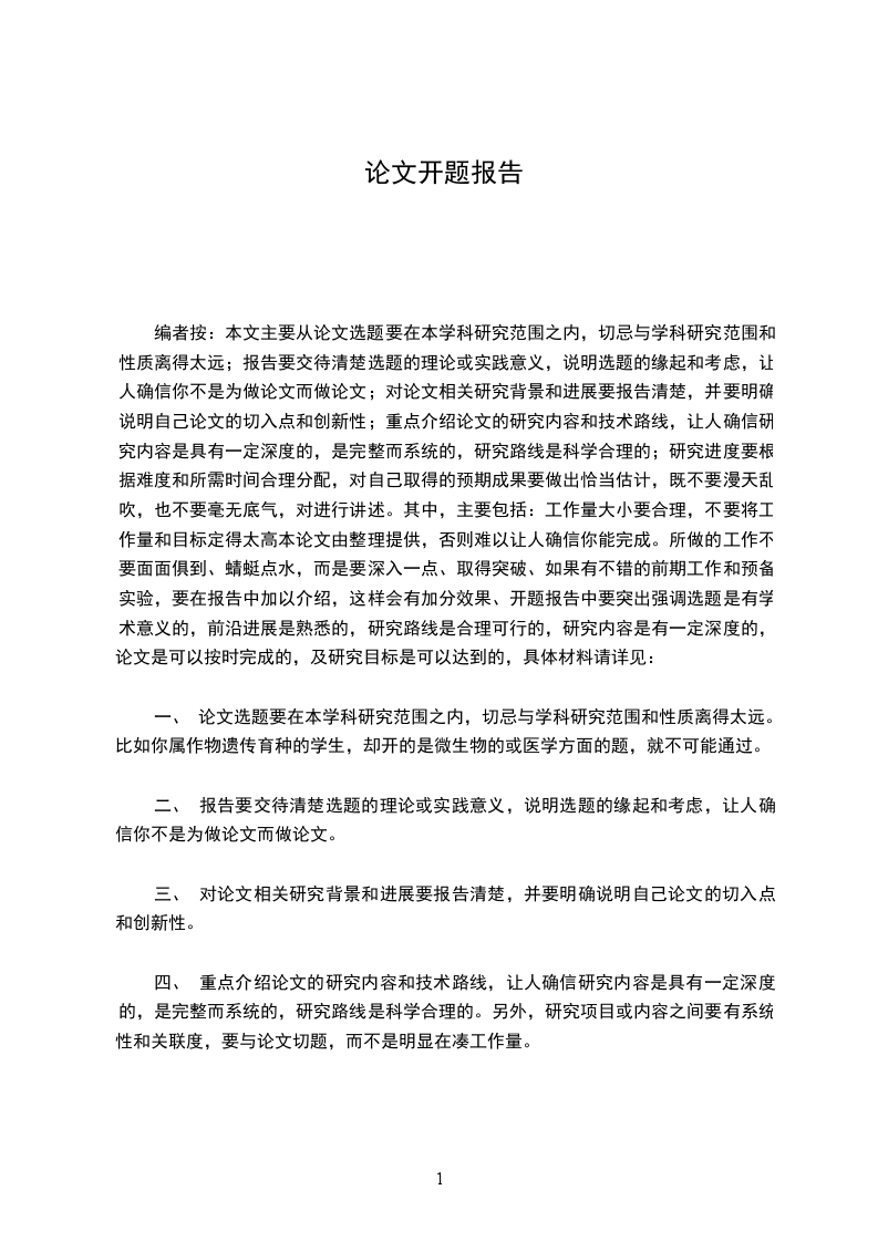 编者按:本文主要从论文选题要在本学科研究范围之内,切忌与学科研究范围和性质离得太远;报告要交待清楚选题的理论或实践意义,说明选题的缘起和考虑,让人确信你不是为做论文而做论文;对论文相关研究背景和进展要报告清楚,并要明确说明自己论文的切入点和创新性;重点介绍论文的研究内容和技术路线,让人确信研究内容是具有一定深度的,是完整而系统的,研究路线是科学合理的;研究进度要根据难度和所需时间合理分配,对自己取得的预期成果要做出恰当估计,既不要漫天乱吹,也不要毫无底气,对进行讲述。其中,主要包括:工作量大小要合理,不要将工作量和目标定得太高本论文由整理提供,否则难以让人确信你能完成。所做的工作不要面面俱到、蜻蜓点水,而是要深入一点、取得突破、如果有不错的前期工作和预备实验,要在报告中加以介绍,这样会有加分效果、开题报告中要突出强调选题是有学术意义的,前沿进展是熟悉的,研究路线是合理可行的,研究内容是有一定深度的,论文是可以按时完成的,及研究目标是可以达到的,具体材料请详见: