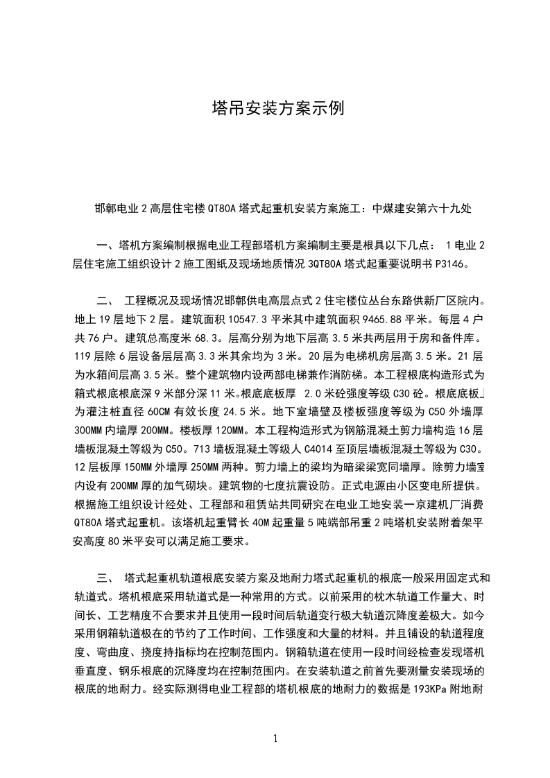 一、 塔机方案编制根据电业工程部塔机方案编制主要是根具以下几点:1电业2层住宅施工组织设计2施工图纸及现场地质情况3QT80A塔式起重要说明书P3146。