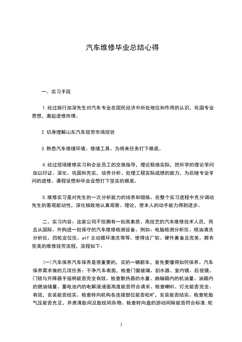 (10)装电瓶并发动发动机试车安装电瓶时要把总的搭铁线螺栓用砂纸砂光亮,使其导电优良。在装接线柱时该当先装正极后装负极,防止装好负极装正极时不当心搭铁产生火花伤人。发动发动机试车,在试车前要先加好机油、转向助力油、刹车油、冷却液、空气滤清器以及汽油,细心检查一下便能够发动。发动后用电脑检测仪检查有无其它毛病,然后调试。__汽车维修毕业总结四年的大学生活即将结束,毕业之即,总结一下大学四年的得失,从中改进不足的地方坚持做得好的方面。使自己回顾走过的路,也更是为了看清将来要走的路。我在校期间,在学校的指导、老师的教诲、同学的帮助下,通过不断地学习理论知识和参与社会实践,自觉自己的综合素质在很大程度上得到了提升。对系统完善的汽车专业知识的学习,有了扎实的专业基础知识,一定的分析问题、解决问题的能力及较强的动手能力。课外大量借阅图书馆中汽车类书刊资料,了解中国汽车产业发展动态方向,特别是汽车后市场服务领域。知道汽车维修行业发展现状及趋势,善于学习新的知识方法工艺,分析和解决问题的能力强,能够熟练的利用互联网查询汽车维修资料,收集本行业信息。“老老实实为人,本本分分做事”是一个立足社会的根本,也是我时刻铭记的一句话。拥有良好的职业素质和职业操守,能够忠于自己的企业,将个人的职业生涯规划与企业的发展紧密的结合。勇于创新,善于开创,能承受较高的工作压力;吃苦耐劳,注重合作,具有年轻人火一样的工作热情和活力,成为一个有技术,会管理,善经营汽车的人。将是我一直努力和奋斗的目标。当然在这个人才济济的社会中我不一定是最好的,但我一定会努力的挤身于这一优秀的行列之中,在中国的汽车业中实现自己的社会价值。四年的大学生活,虽然使自己的知识水平,思想境界,工作能力等方面都迈上了一个新的台阶.但这四年的锻炼,给我仅是初步的经验积累,对于迈向社会还是远远不够的.在这即将挥手告别美好大学生活,踏上社会征途的时候,我整军待发,将以饱满的热情,坚定的信心,高度的责任感去迎接新的挑战。__汽车维修毕业总结一.工作态度,思想工作。我热衷于本职工作,严以律己,遵守工厂的各项规章制度,严格要球自己,摆正工作位置,时刻保持“谦虚,谨慎,律己,积极向上”的工作态度,在领导的关心指导和同事们的帮助下,始终勤奋学习,积极进取,努力提高自我,始终勤奋工作,认真完成任务,履行好岗位的职责。不断加强学习,牢固自己的工作技术!在干好工作的同时与其他同事的人际关系也很重要,因为一个人的能力有限,每件事的成功都是靠集体的智慧,所以和同事们团结在一起才是成功完成领导交给的工作任务的前提,这一点不仅仅是工作,平时的生活中也事如此,所以团结其他同事不仅是个人的事也是一种工作的义务!我和同事关系很好,经常互相帮助,因为我在汽修长里是钳工岗位,有的工作必修要和同事共同才可以完成,比如_的油箱,车门的维修。,在工作中,互相协作。对于过去的得与失,我会汲取有利的因素强化自己的工作能力,把不利的因素在自己以后的工作中排除,一年的工作让我在为再制造不断前进的道路上做出了一定的成绩,我相信通过我的努力和同事的合作,以及领导们的指导,我会成为一名优秀的员工,充分发挥我的能力,也感谢_导给我这一个合适的工作位置,让我能为社会做出自己该有的贡献。一年来,我认真完成本质工作,我相信在今后的工作中,我还是会继续不断的努力下去。虽然一年以来,我的工作还有不尽人意的地方,不过我相信,只要我在岗位上一天,我就会做出自己最大的努力,将自己所有的精力和能力用在工作上,相信自己一定能够做好!