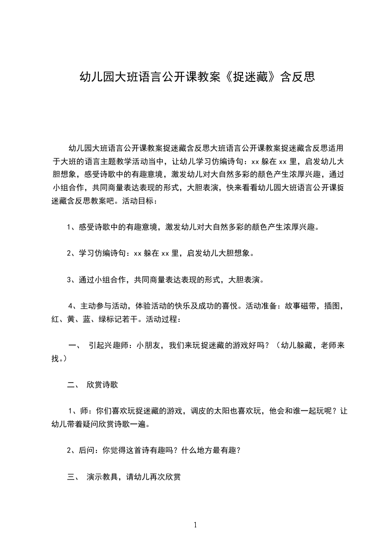 幼儿园大班语言公开课教案捉迷藏含反思大班语言公开课教案捉迷藏含反思适用于大班的语言主题教学活动当中,让幼儿学习仿编诗句:xx躲在xx里,启发幼儿大胆想象,感受诗歌中的有趣意境,激发幼儿对大自然多彩的颜色产生浓厚兴趣,通过小组合作,共同商量表达表现的形式,大胆表演,快来看看幼儿园大班语言公开课捉迷藏含反思教案吧。活动目标: