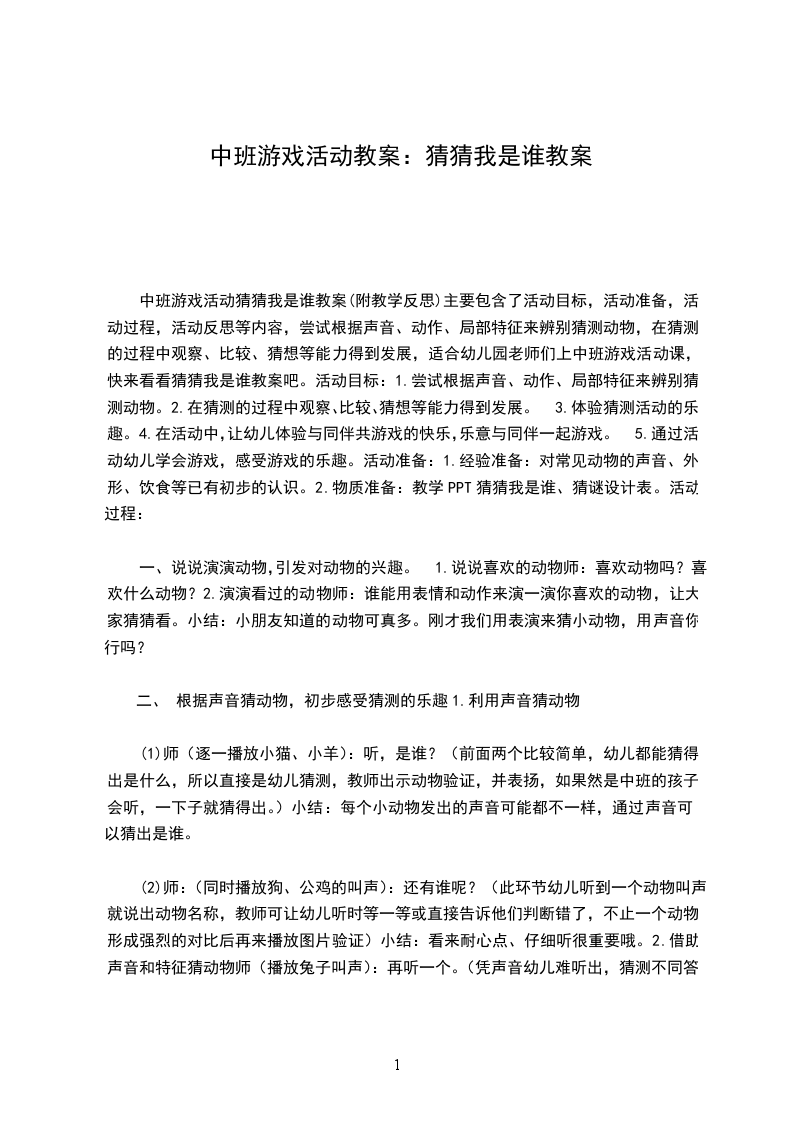 中班游戏活动猜猜我是谁教案(附教学反思)主要包含了活动目标,活动准备,活动过程,活动反思等内容,尝试根据声音、动作、局部特征来辨别猜测动物,在猜测的过程中观察、比较、猜想等能力得到发展,适合幼儿园老师们上中班游戏活动课,快来看看猜猜我是谁教案吧。活动目标:1.尝试根据声音、动作、局部特征来辨别猜测动物。2.在猜测的过程中观察、比较、猜想等能力得到发展。3.体验猜测活动的乐趣。4.在活动中,让幼儿体验与同伴共游戏的快乐,乐意与同伴一起游戏。5.通过活动幼儿学会游戏,感受游戏的乐趣。活动准备:1.经验准备:对常见动物的声音、外形、饮食等已有初步的认识。2.物质准备:教学PPT猜猜我是谁、猜谜设计表。活动过程: