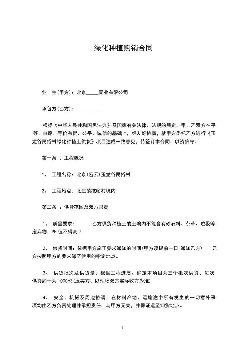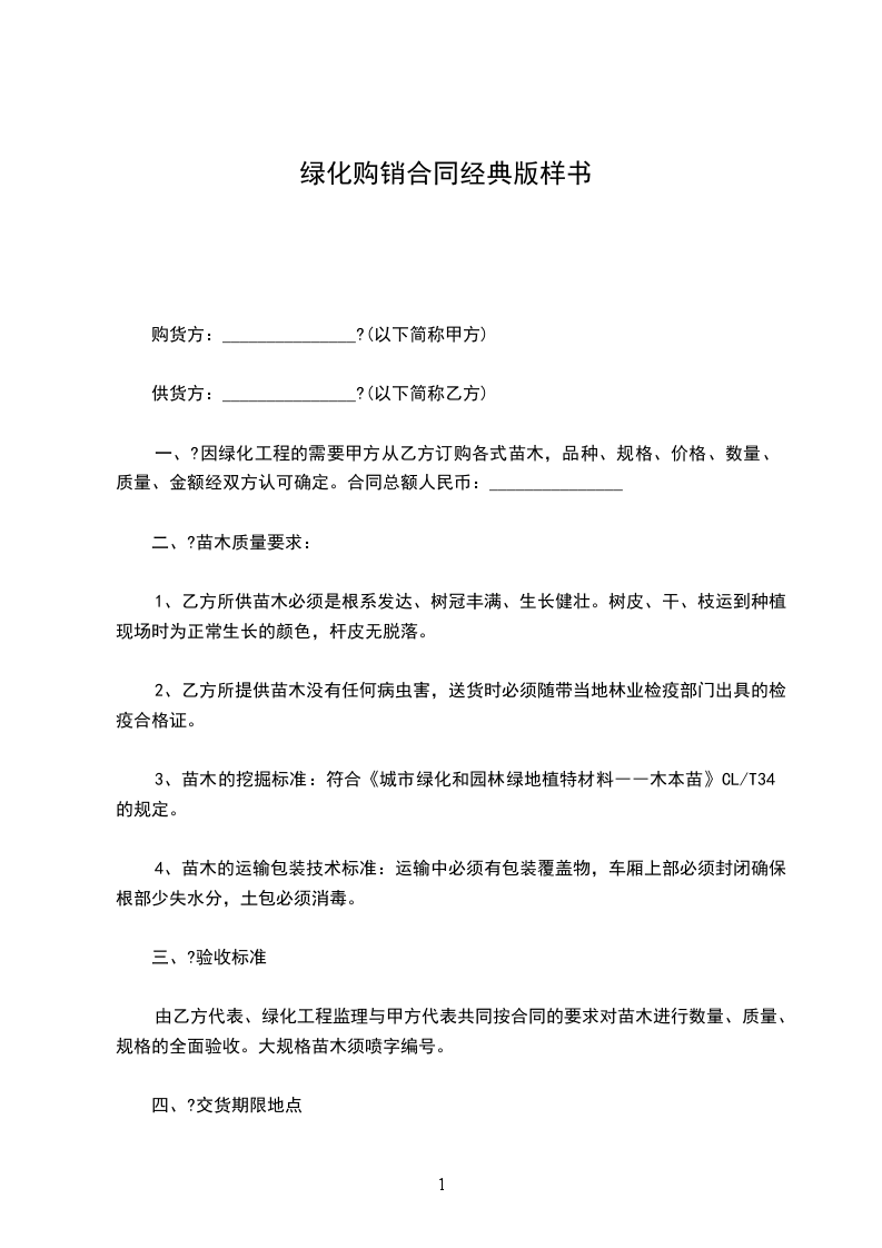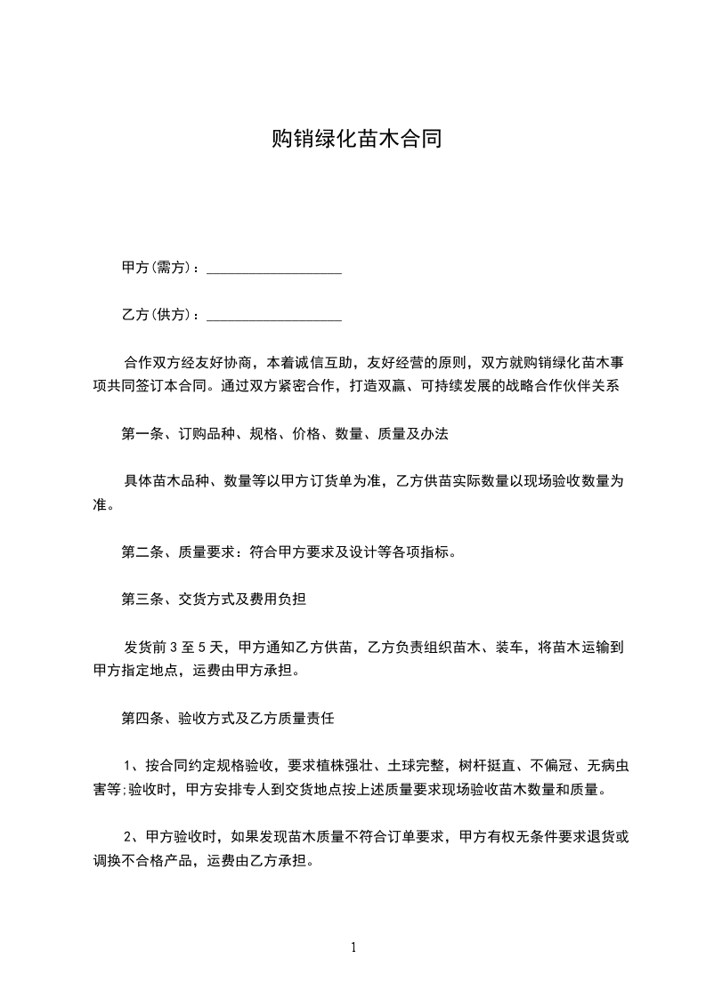 一、?因绿化工程的需要甲方从乙方订购各式苗木,品种、规格、价格、数量、质量、金额经双方认可确定。合同总额人民币:_______________
