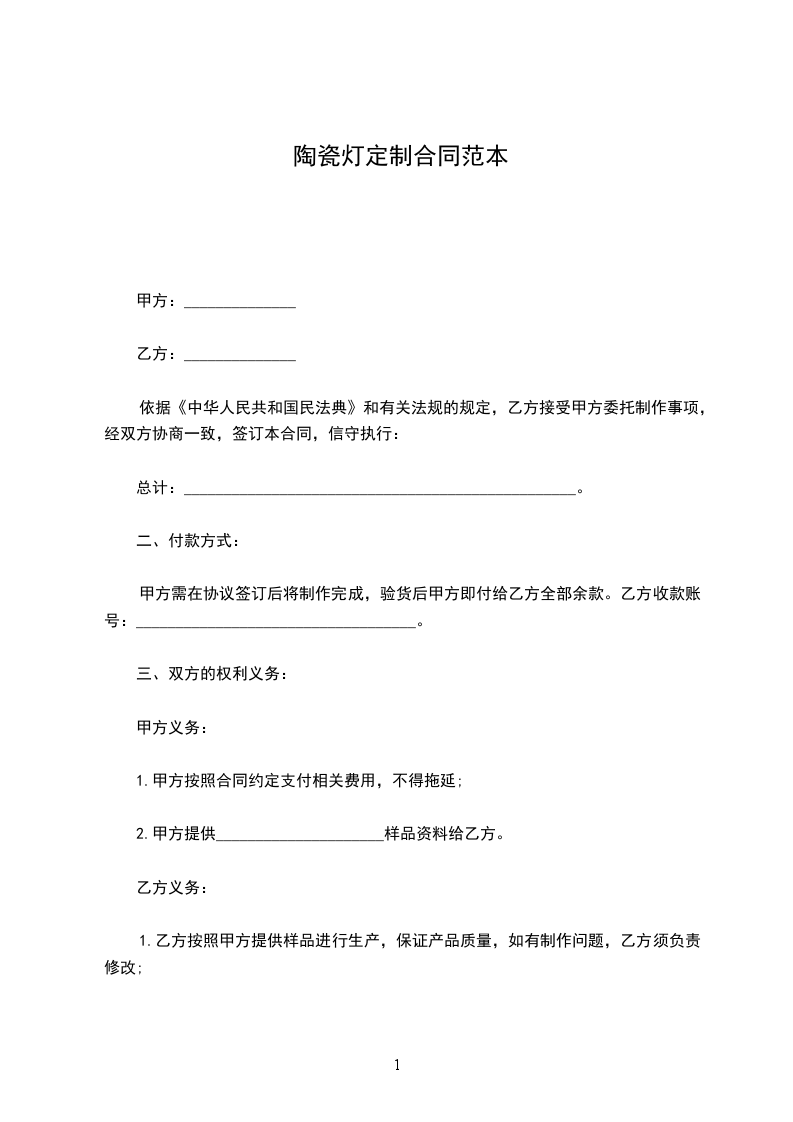 1、交货日期:以甲方支付定金之日起_______天内交货,安装工期为交货之日起_______个工作日。如由于未及时支付定金,造成交货延迟由甲方负责。
