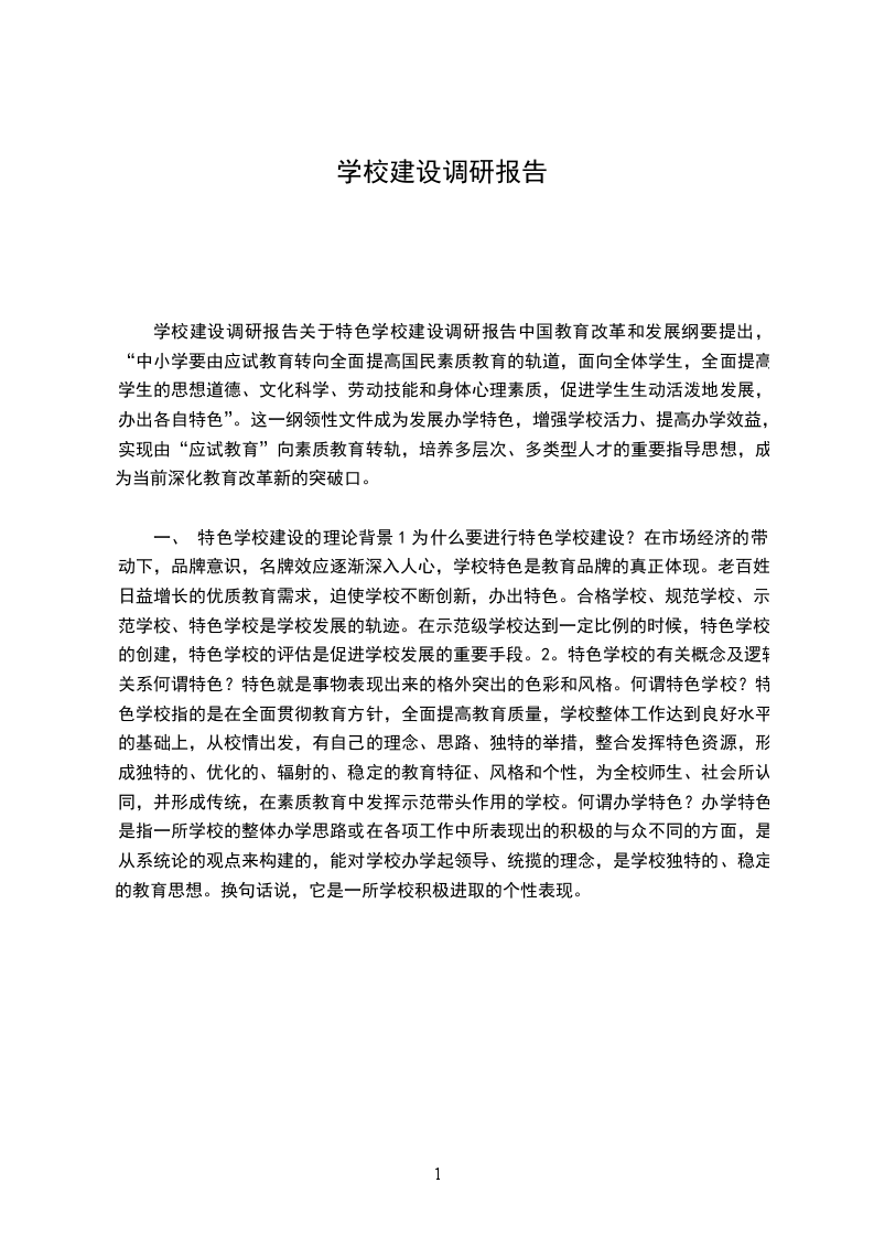 学校建设调研报告关于特色学校建设调研报告中国教育改革和发展纲要提出,“中小学要由应试教育转向全面提高国民素质教育的轨道,面向全体学生,全面提高学生的思想道德、文化科学、劳动技能和身体心理素质,促进学生生动活泼地发展,办出各自特色”。这一纲领性文件成为发展办学特色,增强学校活力、提高办学效益,实现由“应试教育”向素质教育转轨,培养多层次、多类型人才的重要指导思想,成为当前深化教育改革新的突破口。