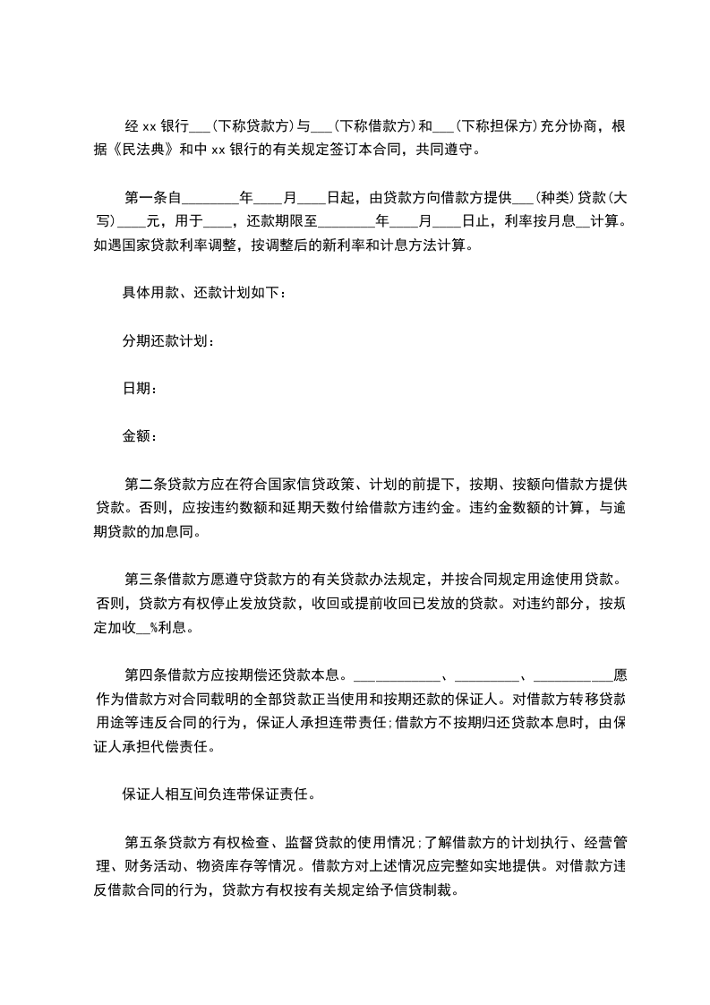 经xx银行___(下称贷款方)与___(下称借款方)和___(下称担保方)充分协商,根据《民法典》和中xx银行的有关规定签订本合同,共同遵守。