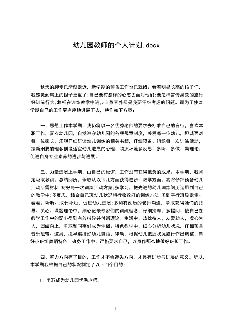 一、思想工作本学期,我仍将以一名优秀老师的要求去标准自己的言行,喜欢本职工作,喜欢幼儿园,自觉遵守幼儿园的各项规章制度,关爱每一位幼儿,坦诚面对每一位家长,乐观仔细研读幼儿训练的相关书籍,仔细预备、组织每一次训练活动,按新纲要的理念创设适宜幼儿进展的心理、物质环境多反思,多听,多做,勤理论,促进自身专业素养的进步与进展。