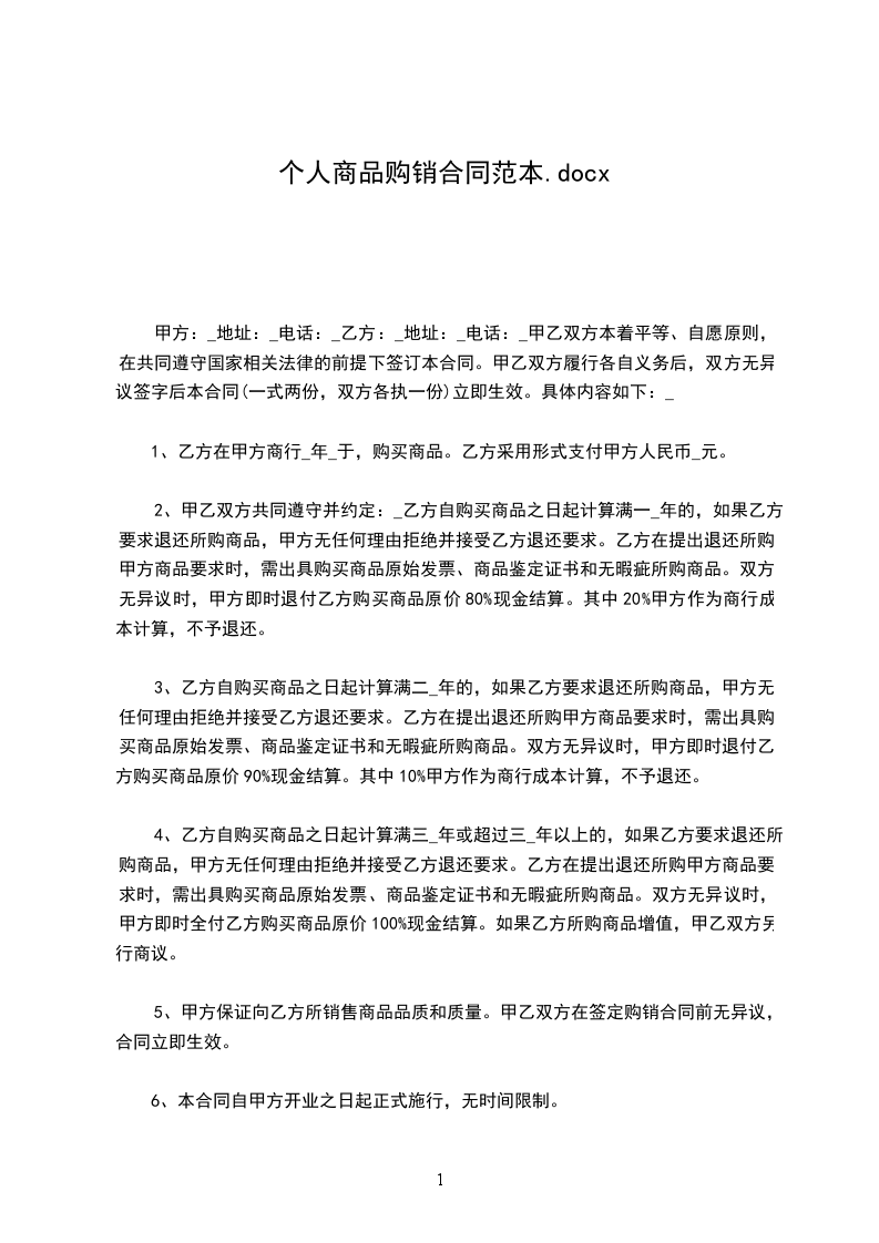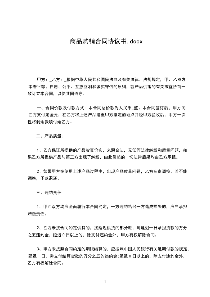 八、 在正常状况下,假设甲方回绝收购,应处以拒收部分价款20%的违约金赔偿;当乙方交货量缺乏时,应处以缺乏部分价款30%的违约金赔偿。