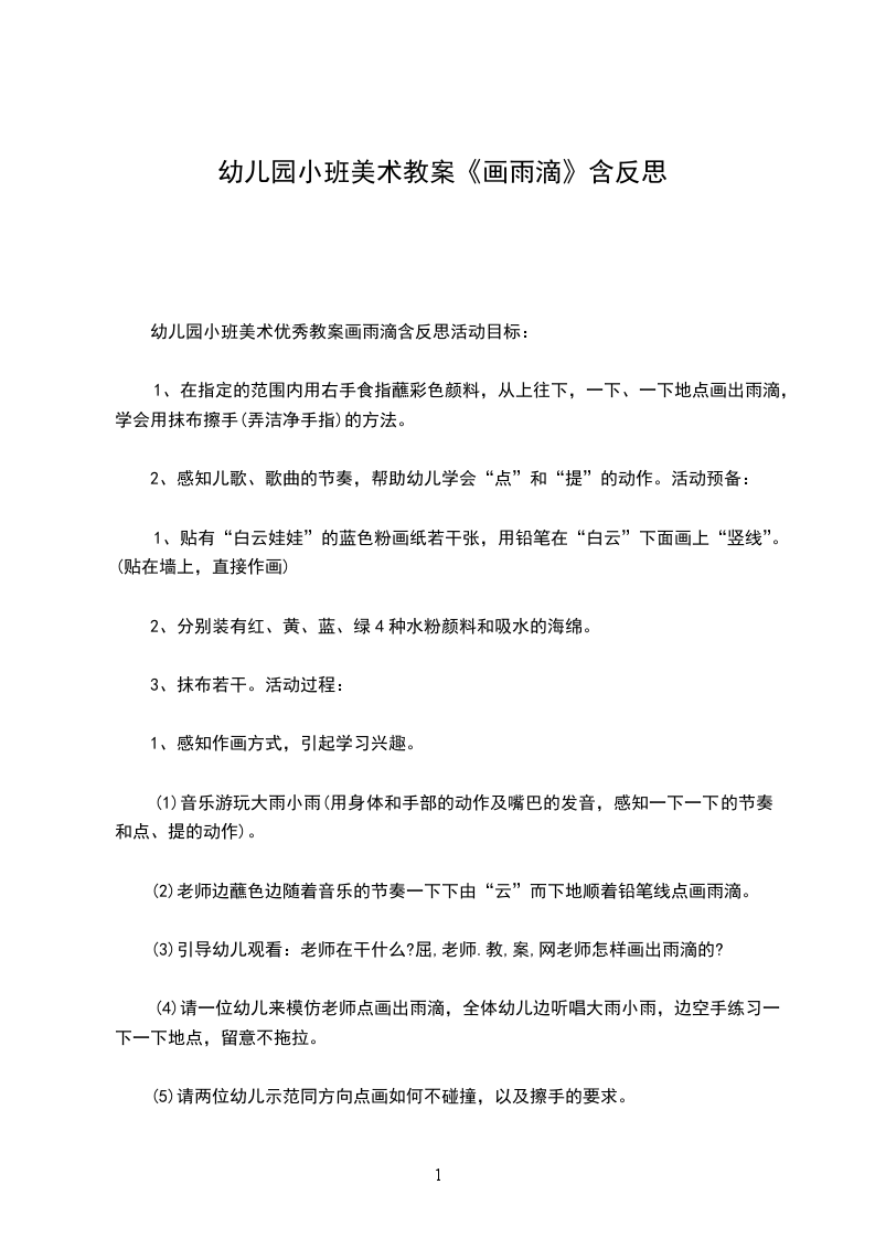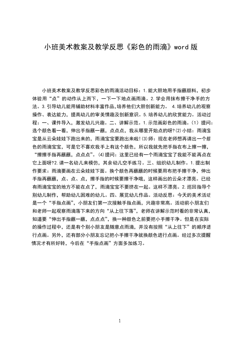 2、结束活动:幼儿听着雨声、音乐声撑着小伞回家活动反思:本次活动是一节美术彩色的雨滴,通过活动我班幼儿对颜色比较敏感,喜欢各种颜色,对颜色有初步的了解,在本次的活动,通过音乐游戏大雨小雨作为导入活动,并让孩子用手指点的动作感受雨滴,然后在孩子操作活动中进一步加深手指点画的乐趣,表现雨点欢快地落下,跳跃的情绪。小班美术优质课教案彩色的雨滴含反思这篇文章共2078字。