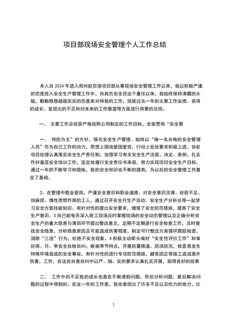 本人自2024年进入郑州航空港项目部从事现场安全管理工作以来,我以积极严谨的态度投入安全生产管理工作中,自肩负安全员这个重任以来,我始终保持清醒的头脑,勤勤恳恳踏踏实实的态度来对待我的工作,现就过去一年的主要工作业绩、获得的成长、呈现出的不足和对未来的工作展望等方面进行简要的总结。