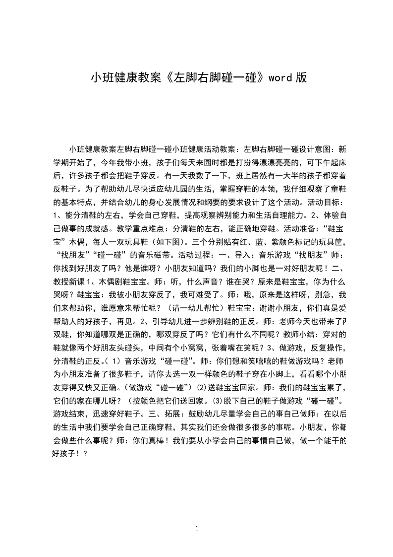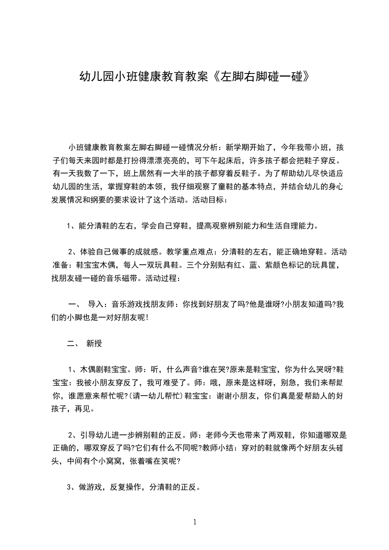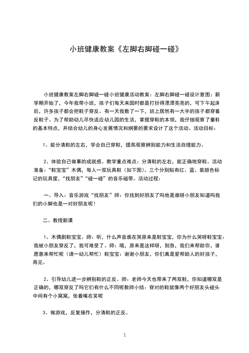 小班健康教育教案左脚右脚碰一碰情况分析:新学期开始了,今年我带小班,孩子们每天来园时都是打扮得漂漂亮亮的,可下午起床后,许多孩子都会把鞋子穿反。有一天我数了一下,班上居然有一大半的孩子都穿着反鞋子。为了帮助幼儿尽快适应幼儿园的生活,掌握穿鞋的本领,我仔细观察了童鞋的基本特点,并结合幼儿的身心发展情况和纲要的要求设计了这个活动。活动目标: